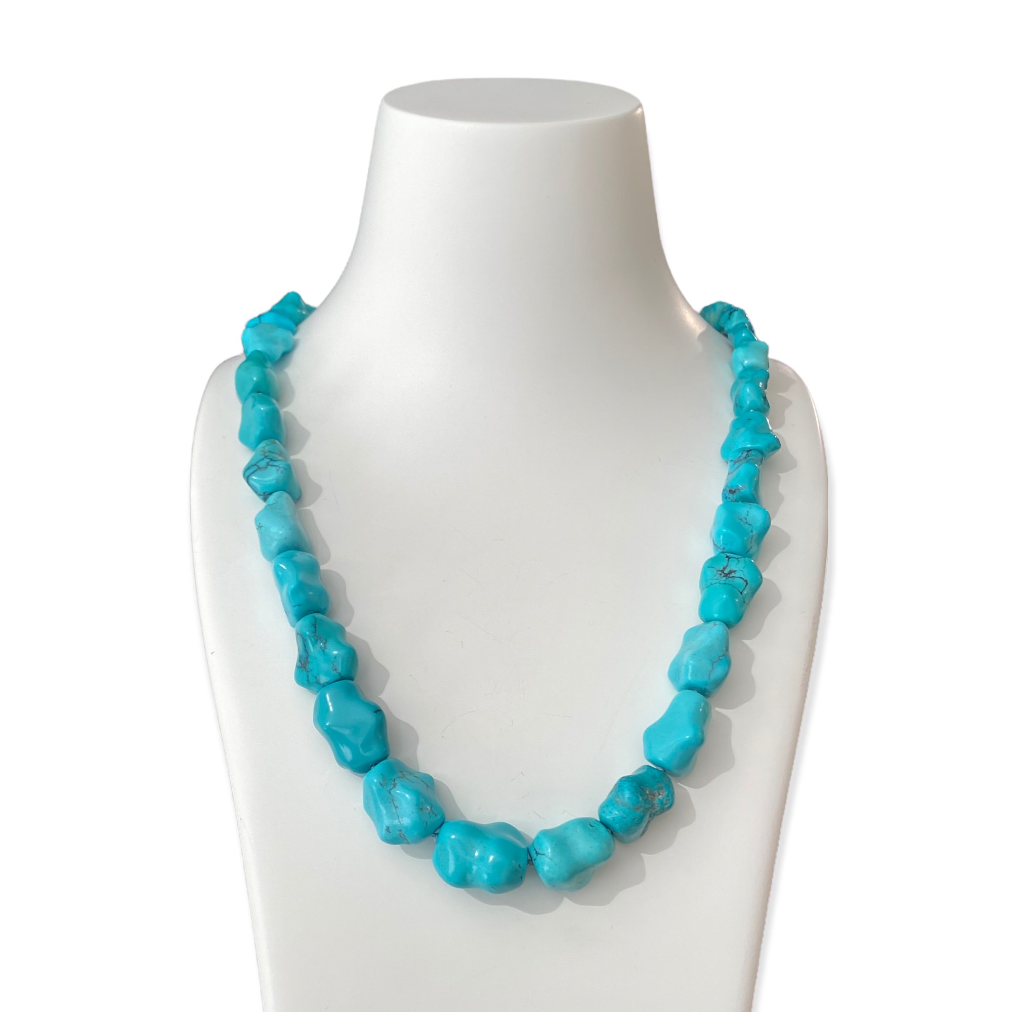 Diese Türkis-Kette besticht durch ihren natürlichen Charme und die lebendige Farbgebung. Die unregelmäßig geformten Türkissteine sind im Verlauf geknüpft – nach vorne hin werden sie größer, was der Kette eine harmonische Linie verleiht. Mit ihrer Länge von 60cm lässt sich die Kette wunderbar solo tragen und bringt die leuchtend türkis-blaue Farbe der Steine besonders schön zur Geltung. Der schlichte Karabiner aus 925er Silber fügt sich dezent ins Gesamtbild ein. Die Farbe des Türkis erinnert an Sommer, Sonne und klare Meeresfarben – ein frischer Akzent für jeden Tag.