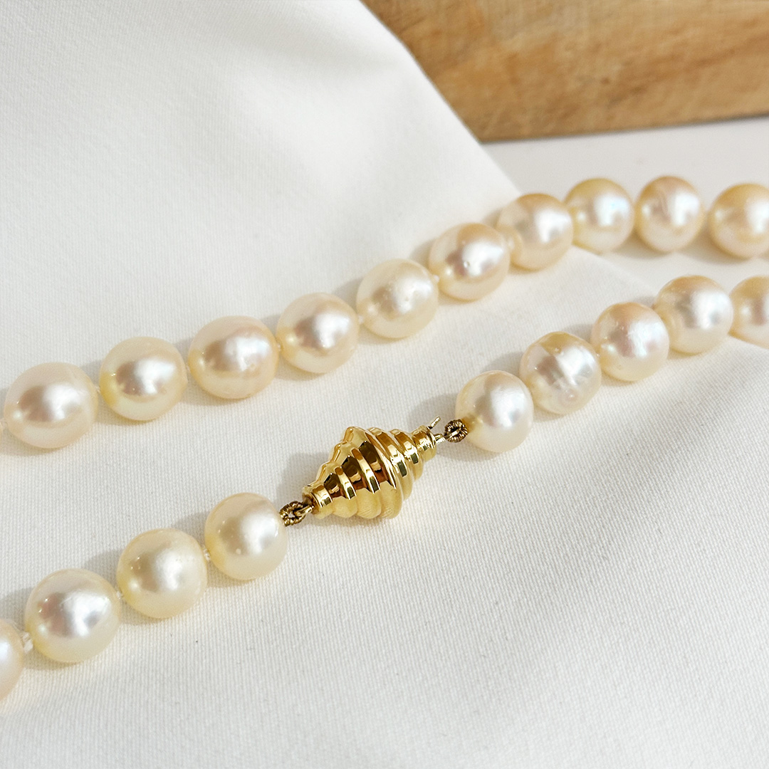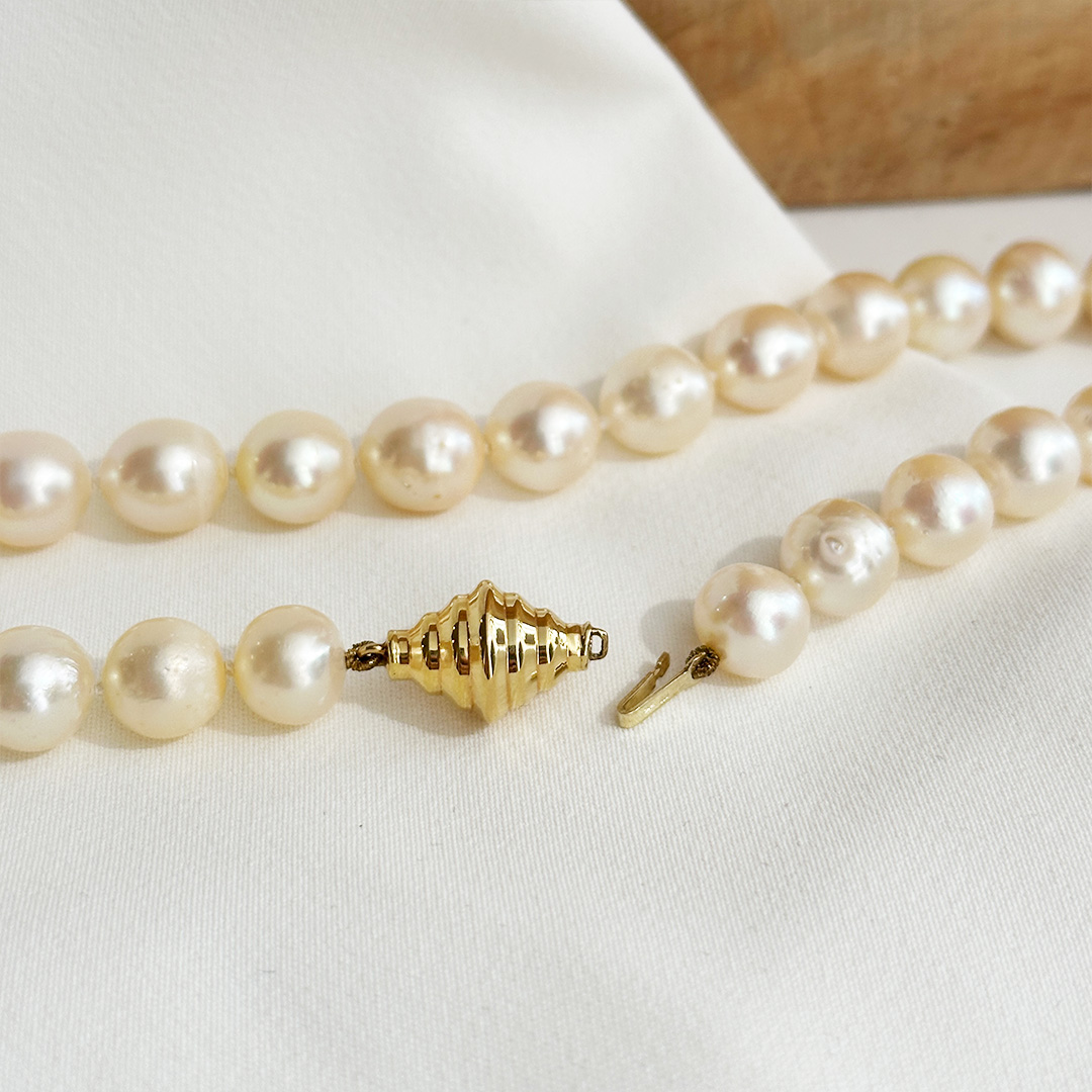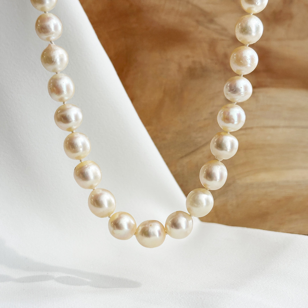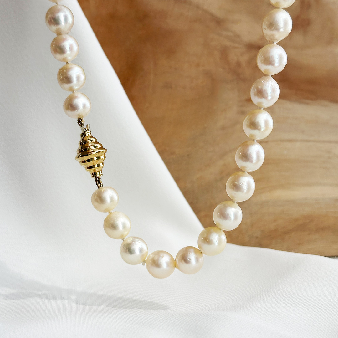 Unsere 45cm lange Akoyaperlenkette mit einer Perlengröße von 9-9,5 mm ist ein zeitloser Klassiker mit einer besonderen Note – die cremefarbene Perlenfarbe, die sie von anderen Ketten in unserem Sortiment unterscheidet. Das Highlight dieser klassischen Kette ist die seitlich getragene 585 Goldschließe, die ein absoluter Blickfang ist und das klassische Design durchbricht. Kombinieren Sie diese einzigartige Perlenkette mit Goldohrringen oder klassischen Perlenohrsteckern aus unserem Sortiment, um Ihren individuellen Stil zu unterstreichen. Egal ob im Alltag oder zu besonderen Veranstaltungen, diese Kette passt einfach immer und verleiht Ihrem Look eine elegante Ausstrahlung. Wir bieten Ihnen auch die Möglichkeit, die Kette zu kürzen oder zu verlängern, um einen perfekten Sitz um Ihren Hals zu gewährleisten. Entdecken Sie die zeitlose Eleganz und das besondere Design dieser Akoyaperlenkette und bereichern Sie Ihren Schmuckstil mit diesem faszinierenden Schmuckstück.
