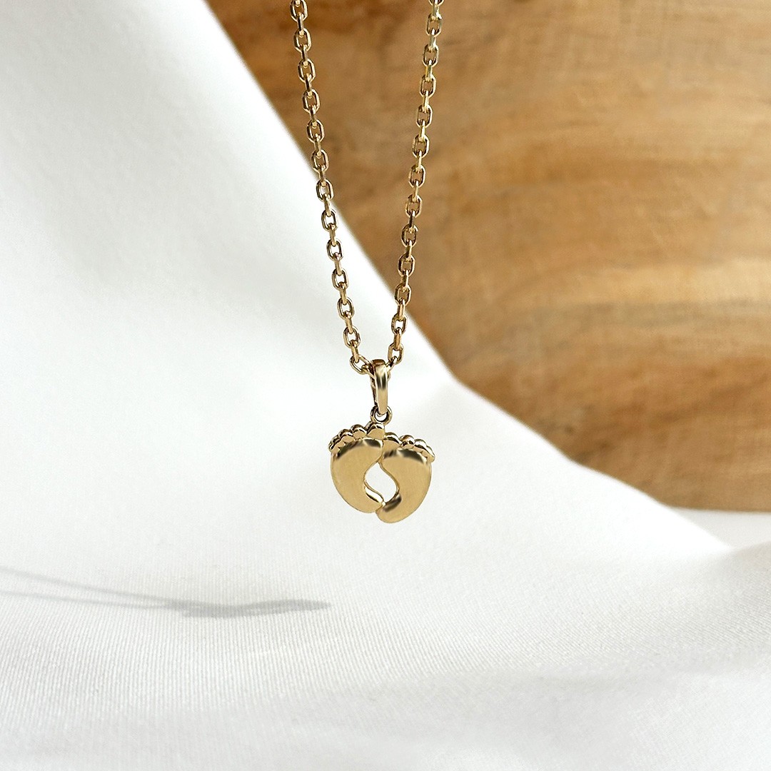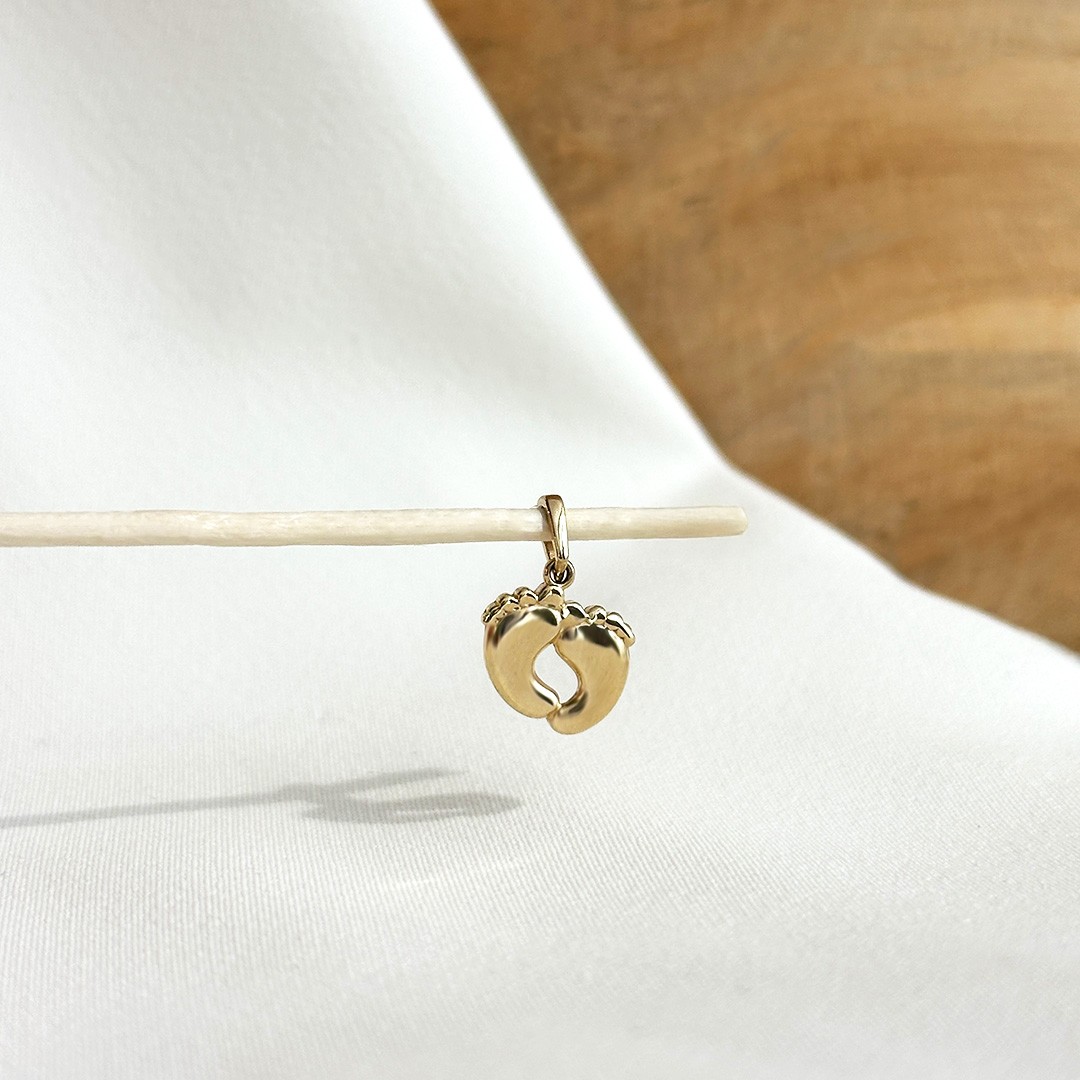 Dieser Anhänger aus 585er Gelbgold zeigt zwei ausgeschnittene Babyfüße und hat eine Größe von ca. 15mm. Er kann sowohl an einer Halskette als auch an einem Bettelarmband getragen werden und ist ein liebevolles Geschenk zur Geburt – für die frischgebackene Mama ebenso wie für das Kind. In Kombination mit einer Gravurplatte lässt sich der Anhänger zusätzlich personalisieren, etwa mit einem Namen, einem Datum, Initialen oder einem kurzen Spruch. Ein zarter Schmuckanhänger, der Erinnerungen bewahrt und durch seine Symbolik besonders berührt.