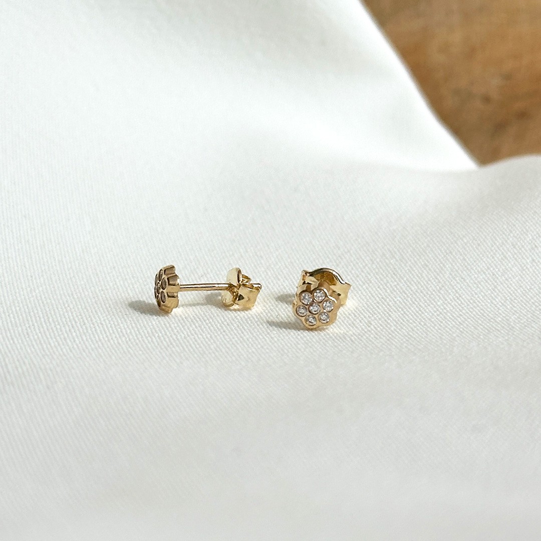 Diese Ohrstecker aus 585er Gelbgold sind in Form kleiner Blümchen gestaltet und mit funkelnden Zirkonia besetzt. Mit einem Durchmesser von 4 mm sind sie zart gearbeitet und ideal für Kinderohren geeignet. Die schimmernden Steine verleihen den Ohrsteckern eine fröhliche Leichtigkeit und bringen bei jeder Bewegung ein feines Funkeln zum Vorschein. Ein liebliches Schmuckstück, das Kindern Freude bereitet und sich wunderbar als Geschenk für besondere Anlässe eignet.