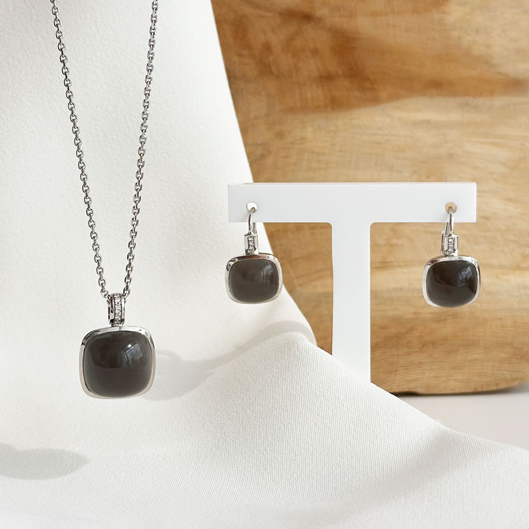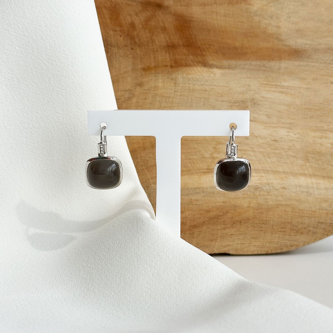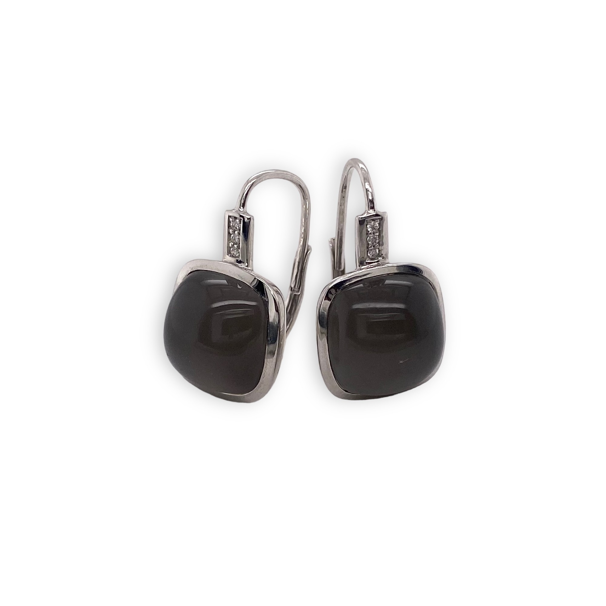 Diese eleganten Ohrringe sind aus 585er Weißgold gefertigt und vereinen klassisches Design mit Moderne. Im Mittelpunkt steht ein sanft schimmernder Mondstein, der durch seine ruhige Ausstrahlung eine sportlich-schicke Note mitbringt. Darüber sitzen kleine, fein gefasste Brillanten, die den Ohrschmuck dezent verlängern und ihm einen Hauch von Glanz verleihen. Die Kombination aus dem kühlen Weißgold, dem geheimnisvollen Schimmer des Mondsteins und dem Funkeln der Brillanten macht diese Ohrringe zu einem stilvollen Begleiter – unaufdringlich und doch besonders. Die Brisuren sorgen für sicheren Halt und ein angenehmes Tragegefühl im Alltag wie zu besonderen Anlässen.