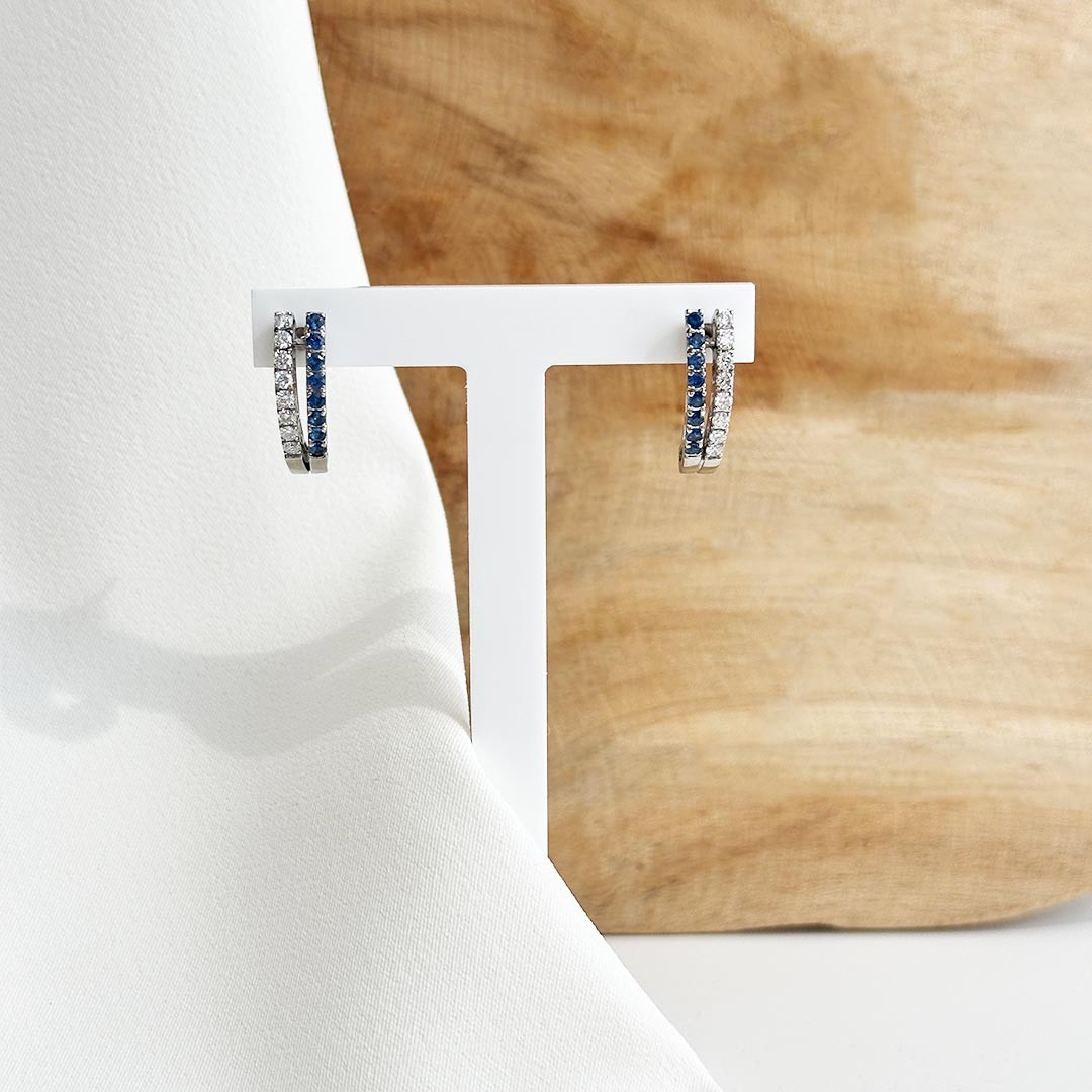 Diese halbrunden Creolen aus 750 Weißgold mit Brillanten und Saphiren zeichnen sich durch ein modernes Design und elegante Details aus. In zwei Reihen sind funkelnde Brillanten und leuchtend blaue Saphire gefasst. Die Kombination aus strahlendem Weißgold, dem Glanz der Brillanten und dem intensiven Blau der Saphire verleiht den Ohrsteckern eine sportlich-elegante Ausstrahlung, die sowohl im Alltag als auch zu besonderen Anlässen perfekt passt.