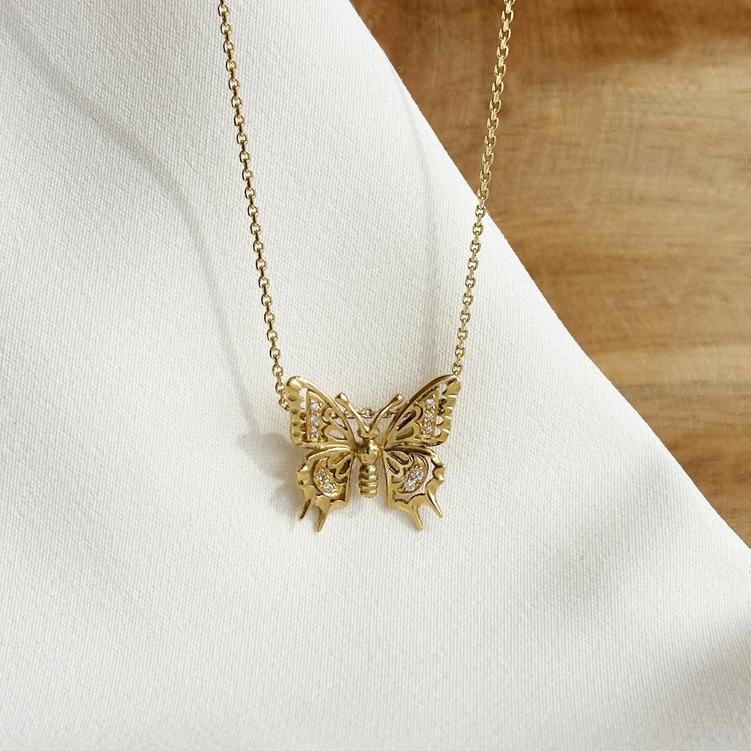 Ein Hauch von Eleganz und Leichtigkeit: Dieser Schmetterling-Anhänger aus 750er Gelbgold begeistert mit seinem feinen Design und strahlender Brillanz. Besetzt mit insgesamt 0,10ct funkelnden Brillanten verleiht er ein zartes Leuchten und zieht bewundernde Blicke auf sich. Der Schmetterling symbolisiert Veränderung, Freiheit und die Schönheit der Natur – eine tiefere Bedeutung, die diesem Schmuckstück seine besondere Ausstrahlung verleiht. Mit einer Größe von ca. 18×20 mm schmiegt sich der Anhänger harmonisch ans Dekolleté und eignet sich perfekt als täglicher Begleiter oder als besonderes Geschenk. Kombinieren Sie den Halsschmuck mit schlichten Ohrsteckern.