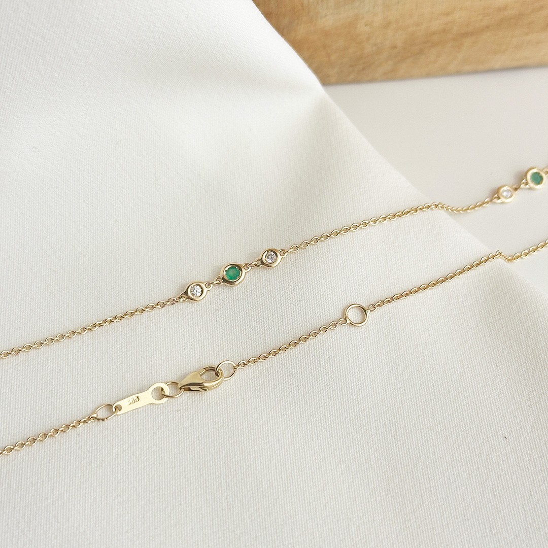 Dieses Collier aus 585er Gelbgold vereint feine Zurückhaltung mit einem lebendigen Farbspiel. Die zarte Ankerkette wird in regelmäßigen Abständen von rund gefassten Brillanten und leuchtenden Smaragden geschmückt. Im Wechsel angeordnet – Brillant, Smaragd, Brillant – entstehen kleine, harmonische Akzente entlang der Kette, die durch feine Kettenglieder voneinander getrennt sind. Dadurch wirkt das Collier leicht und fein, erhält jedoch durch das Zusammenspiel von funkelnden Diamanten und dem intensiven Grün der Smaragde eine besondere Ausstrahlung. Es legt sich elegant an den Hals und eignet sich sowohl als stilvoller Begleiter im Alltag als auch für besondere Anlässe. Ein feines Schmuckstück mit Farbe und Brillanz, das als Geschenk ebenso viel Freude bereitet wie für die eigene Schmucksammlung.