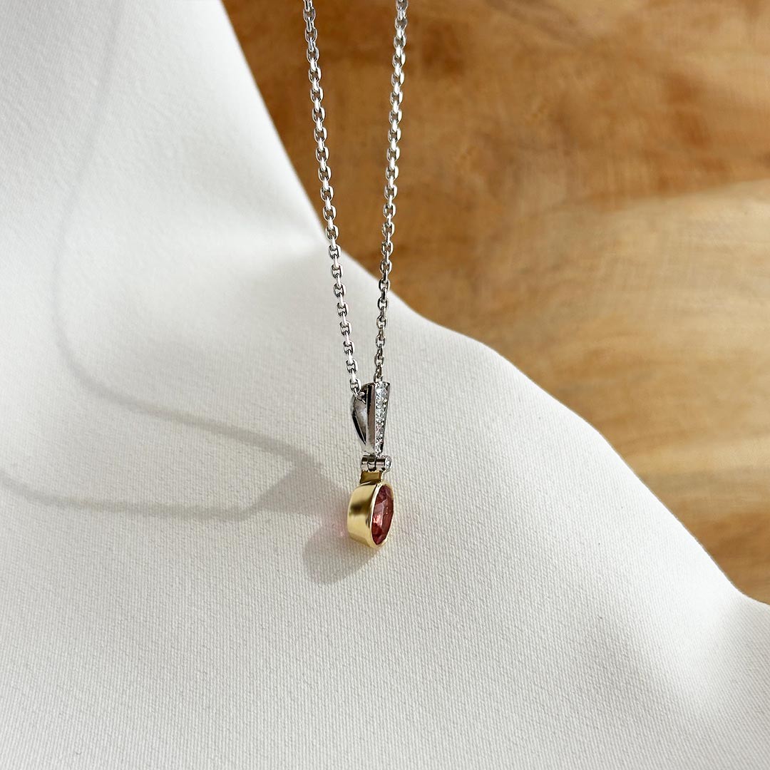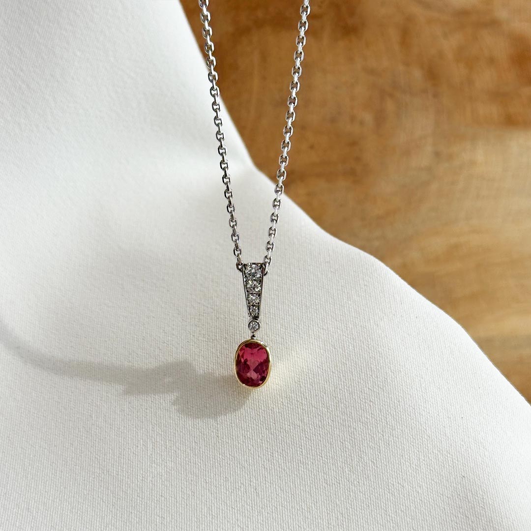 Dieser handgefertigte Anhänger aus 585 Weiß- und Gelbgold verbindet klare Linien mit feinster Edelsteinfassung. Im oberen Bereich sind Brillanten in Weißgold eingefasst – dezent abgestuft im Verlauf, sodass ihr Funkeln sanft nach unten führt. Den Abschluss bildet ein ovaler rosa-rot schimmernder Turmalin, der glatt in Gelbgold eingefasst ist und durch die warme Goldfarbe besonders zur Geltung kommt. Mit einer Größe von 20mm bleibt der Anhänger zart, wirkt aber durch die harmonische Gestaltung sehr präsent. Wir empfehlen die Kombination mit einer schlichten Karree-Kette, damit das Schmuckstück seine volle Wirkung entfalten kann. Passend dazu ist auch Ohrschmuck erhältlich.