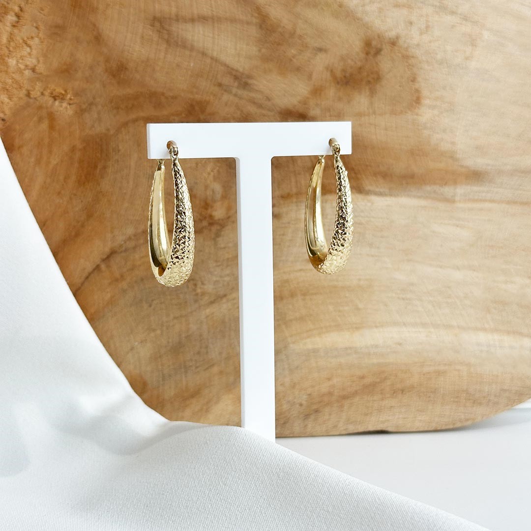 Diese eleganten Creolen aus 585er Gelbgold überzeugen durch ihre außergewöhnliche Form und eine raffiniert gearbeitete Oberfläche. Die ovale Silhouette verläuft nach unten hin sanft in die Breite und verleiht dem Design eine harmonische Dynamik, die zugleich modern und zeitlos wirkt. Das Spiel aus Form und Struktur lässt das Gold bei jeder Bewegung lebendig schimmern und unterstreicht die besondere Ausstrahlung dieser Creolen. Ein ausdrucksstarkes Schmuckstück, das sowohl im Alltag als auch zu festlichen Anlässen stilvolle Akzente setzt.