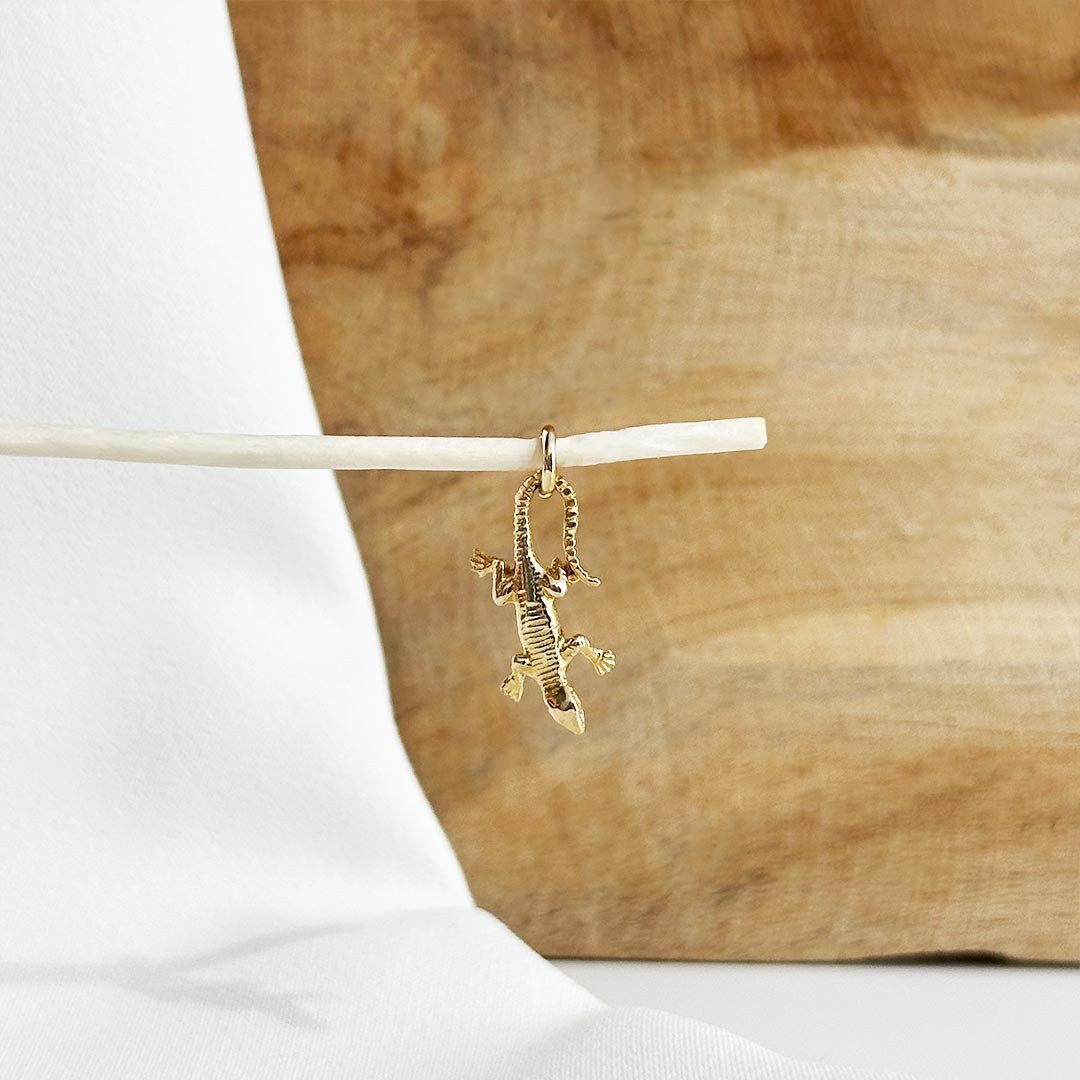 Dieser kleine Eidechsen-Anhänger aus 585er Gelbgold hat eine Größe von 18mm. Als Anhänger für das Bettelarmband bringt er eine charmante und natürliche Note in Ihre Schmucksammlung. Die Eidechse symbolisiert für viele Menschen Verbundenheit mit der Natur, ein ideales Motiv für Naturliebhaberinnen und Naturliebhaber oder alle, die ihre Leidenschaft für die Tierwelt stilvoll zum Ausdruck bringen möchten. Passende Bettelarmbänder finden Sie selbstverständlich ebenfalls in unserem Sortiment.