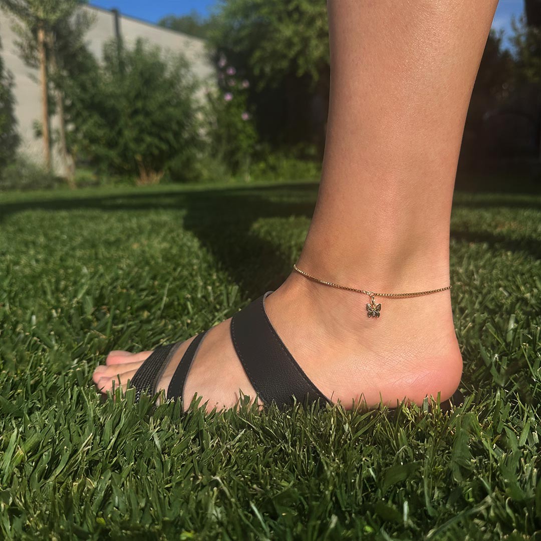 Die charmante Fußkette aus 585er Gelbgold besticht durch ihr elegantes Design in Form einer Venezianerkette – eine beliebte Standard-Goldkette. Ein zauberhafter Schmetterling-Anhänger, liebevoll in der Mitte platziert, verleiht der Kette eine verspielte und romantische Note. Mit einer Länge von 26cm schmiegt sie sich sanft um den Knöchel und fängt die Leichtigkeit des Sommers perfekt ein. Dieses Schmuckstück ist ein wunderbares Geschenk für eine lebensfrohe Frau, die das Leben in vollen Zügen genießt und die warmen Sonnentage mit stilvoller Eleganz bereichern möchte. Gerne verpacken wir das Schmuckstück passend zum Anlass.