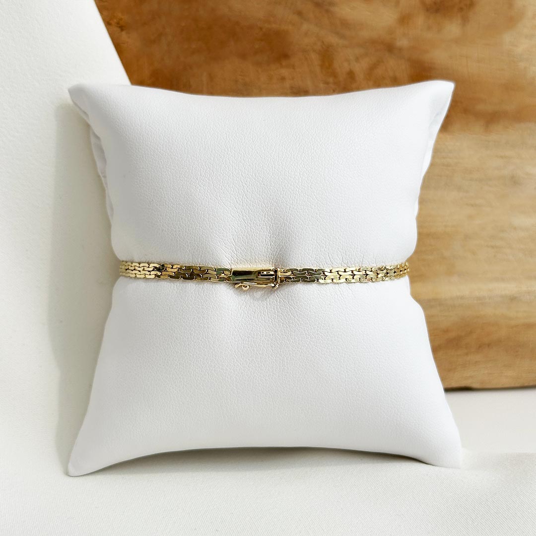 Dieses Goldarmband für Damen ist aus 585 Gelbgold gefertigt und hat eine Länge von 18cm. Dieses Schmuckstück strahlt feine Eleganz aus und ist mit drei roten Rubinen sowie vier funkelnden Diamanten besetzt. Die warme Goldfarbe harmoniert mit den leuchtenden Rubinen, die dem Armband eine besondere Ausdruckskraft verleihen. Die Kontraste zwischen den roten Rubinen und den funkelnden Diamanten schaffen eine faszinierende Dynamik und setzen dieses Armband für besondere Anlässe in Szene. Die warme Farbkombination machen dieses Schmuckstück zu einem zeitlosen Begleiter, der Ihre Persönlichkeit auf dezente und elegante Weise unterstreicht.