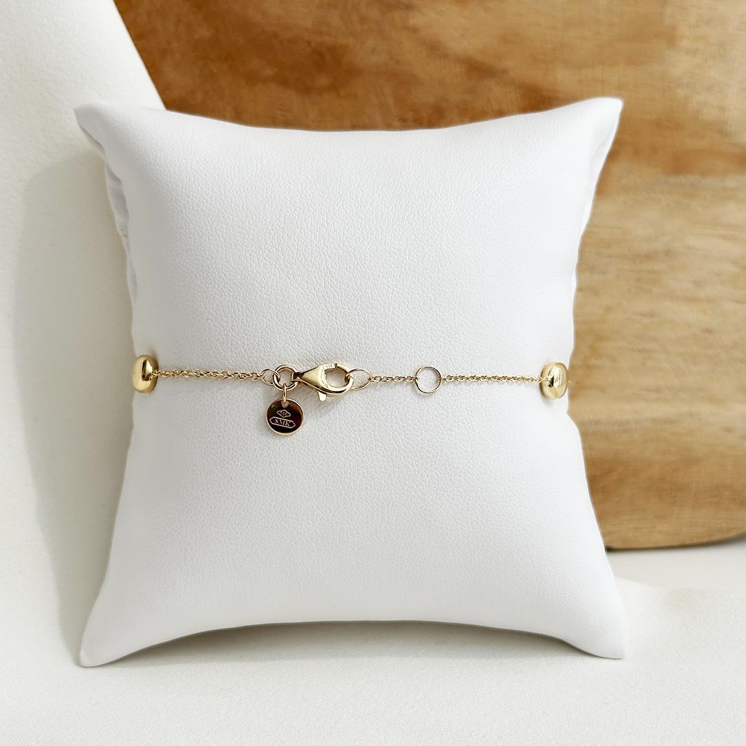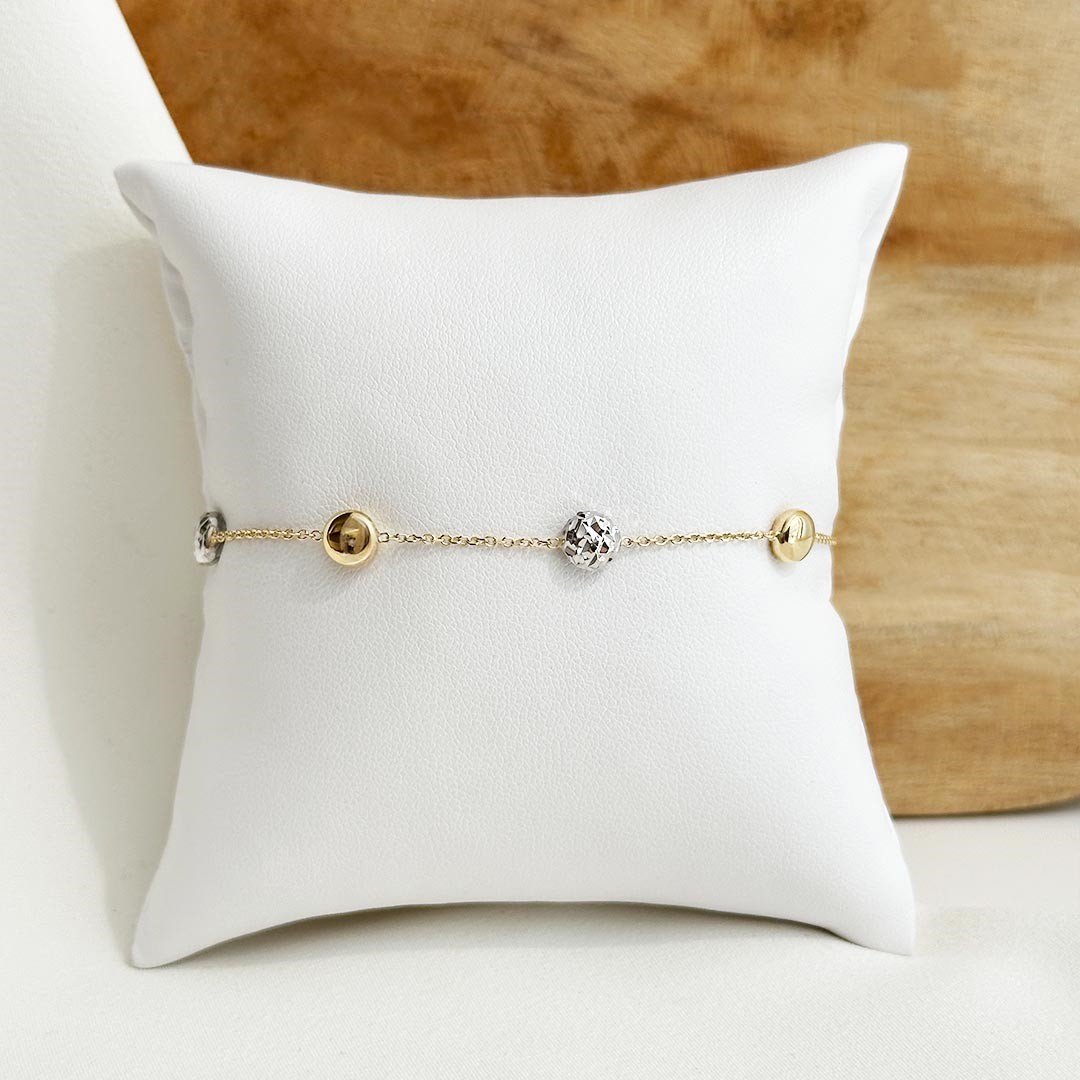 Dieses Armband lebt vom Zusammenspiel zweier Goldtöne: Zwischenelemente aus poliertem Gelbgold und diamantiertem Weißgold setzen elegante Kontraste und verleihen dem Design eine lebendige Struktur. Die feine Abwechslung der Oberflächen sorgt für Lichtreflexe und unterstreicht die hochwertige Verarbeitung. Mit einer Länge von 19cm und einer Zwischenöse bei 18cm lässt sich das Armband flexibel anpassen und passt sich optimal dem Handgelenk an. Ob solo getragen oder in Kombination – dieses Schmuckstück überzeugt durch seine harmonische Ausstrahlung und seine feine Balance zwischen klassisch und modern.
