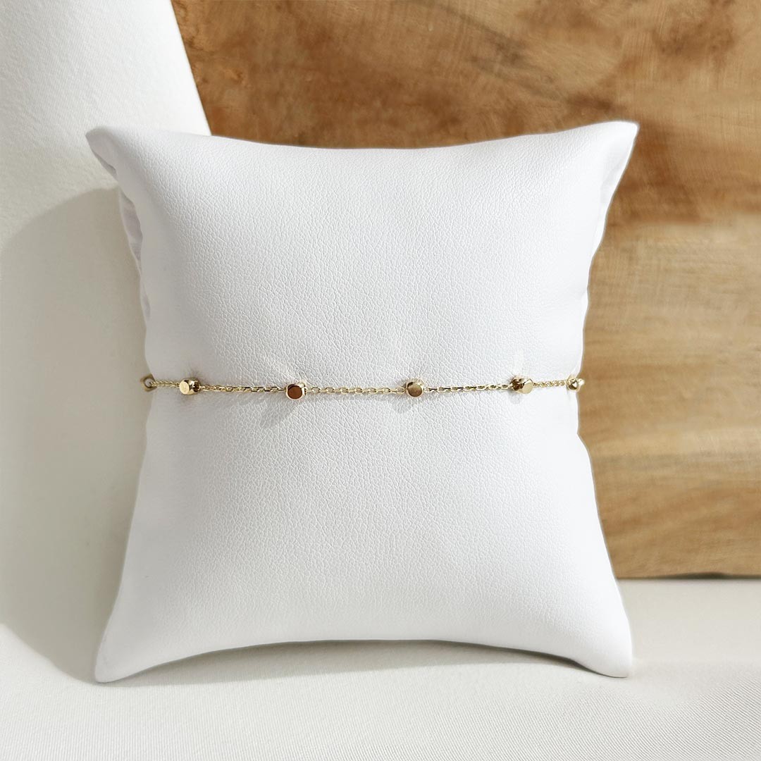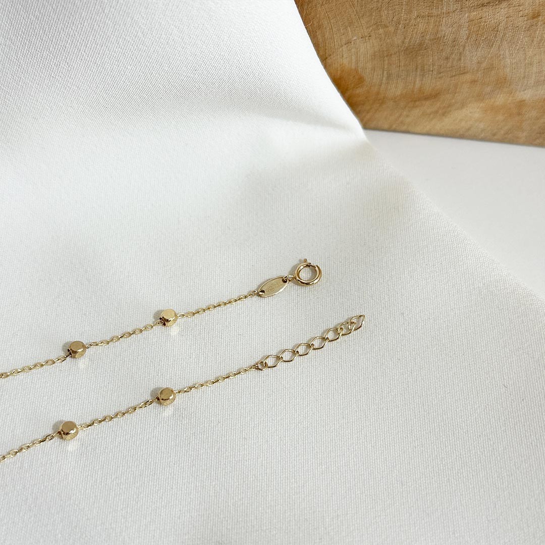 Dieses feine Armband aus 585er Gelbgold besticht durch seine zarte Gliederkette, die in regelmäßigen Abständen von kleinen, polierten Würfeln unterbrochen wird. Diese glänzenden Zwischenelemente fangen das Licht bei jeder Bewegung ein und erzeugen einen dezenten Schimmer – fast wie ein feiner Steinbesatz, ganz ohne Steine. Mit einer Gesamtlänge von 19cm und einer 2cm langen Verlängerungskette lässt sich das Armband individuell anpassen und angenehm tragen. Ein filigranes Schmuckstück mit leichter, funkelnder Wirkung – ideal für den Alltag oder als feiner Akzent zu besonderen Momenten.