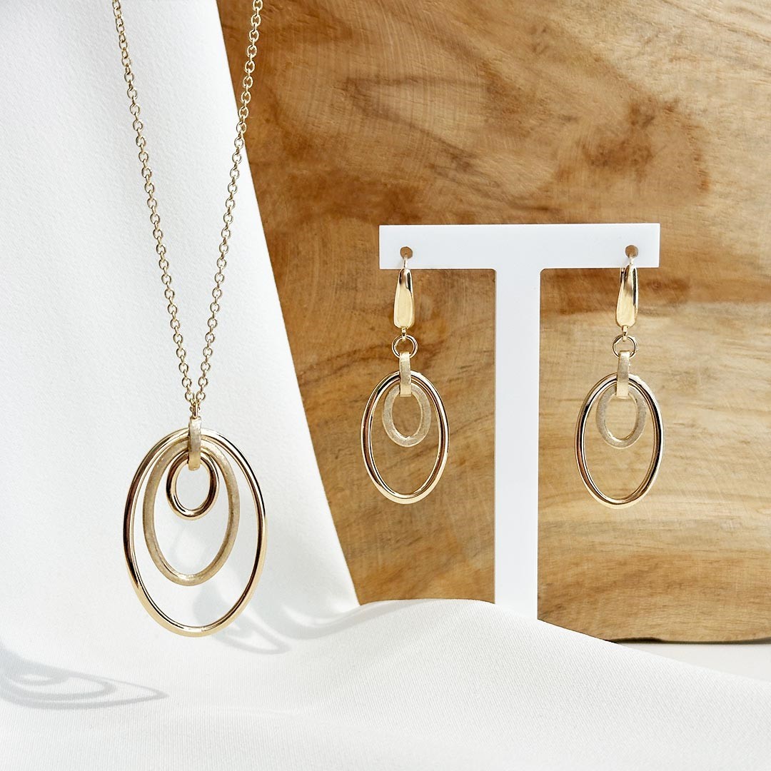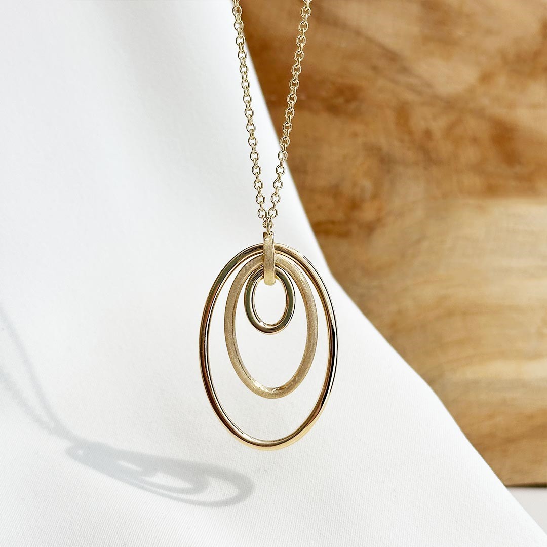 Dieses Goldcollier aus 585 Gelbgold vereint klassische Zurückhaltung mit einer raffinierten Gestaltung. Der Anhänger besteht aus drei ovalen Elementen in unterschiedlicher Größe, wobei die mittlere Form durch ihre mattierte Oberfläche einen dezenten Kontrast schafft. Die harmonische Kombination aus Glanz und Mattierung verleiht dem Collier Tiefe und Eleganz, ohne aufdringlich zu wirken. Mit seiner feinen Linienführung und dem ausgewogenen Design eignet sich dieses Schmuckstück hervorragend zum täglichen Tragen oder als stilvolle Ergänzung zu besonderen Anlässen. Gerne verpacken wir das Schmuckstück passend zum Anlass.