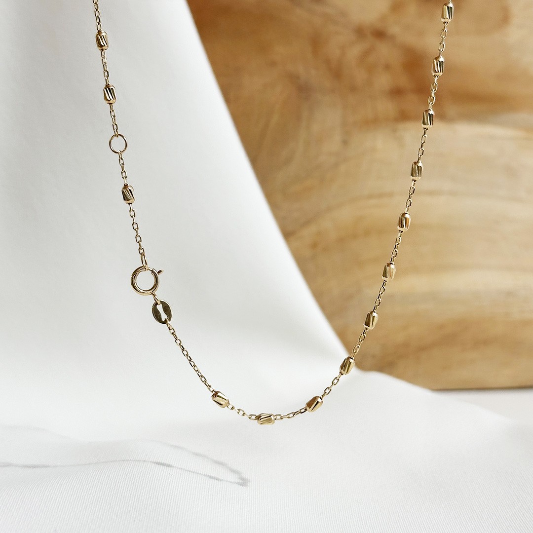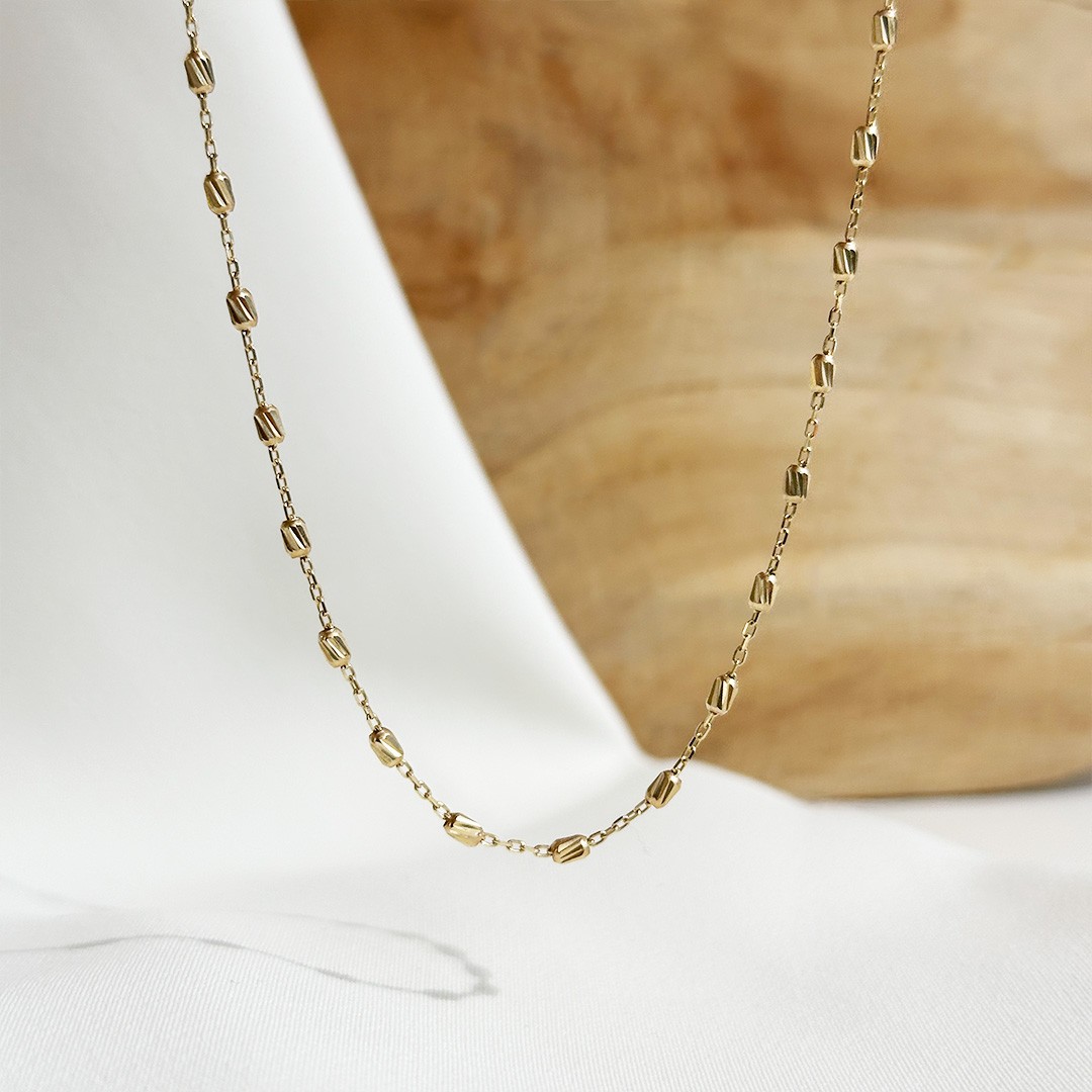 Diese filigrane Goldkette aus 585er Gelbgold vereint zarte Eleganz mit einer besonderen Raffinesse. Kleine, facettierte Kugeln schmücken die feine Kette und erzeugen ein bezauberndes Funkeln, sobald das Licht auf sie trifft. Ihr schlichtes, elegantes Design macht sie zu einem vielseitigen Schmuckstück, das sowohl alleine als auch in Kombination mit anderen Ketten getragen werden kann. Ein zeitloses Accessoire, das sanft den Hals umschmeichelt und jedem Outfit eine edle Note verleiht. Das passende Armband finden Sie ebenfalls in unserem Sortiment.