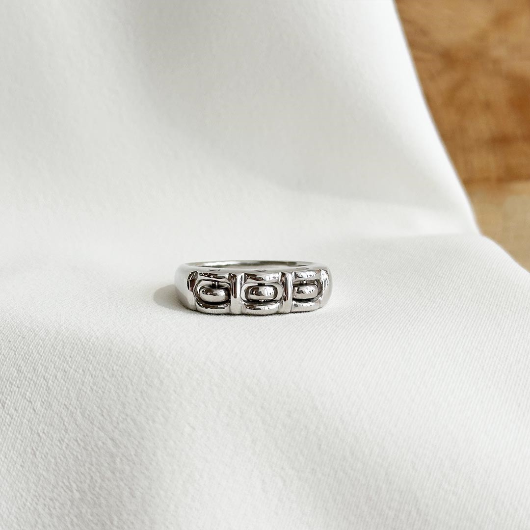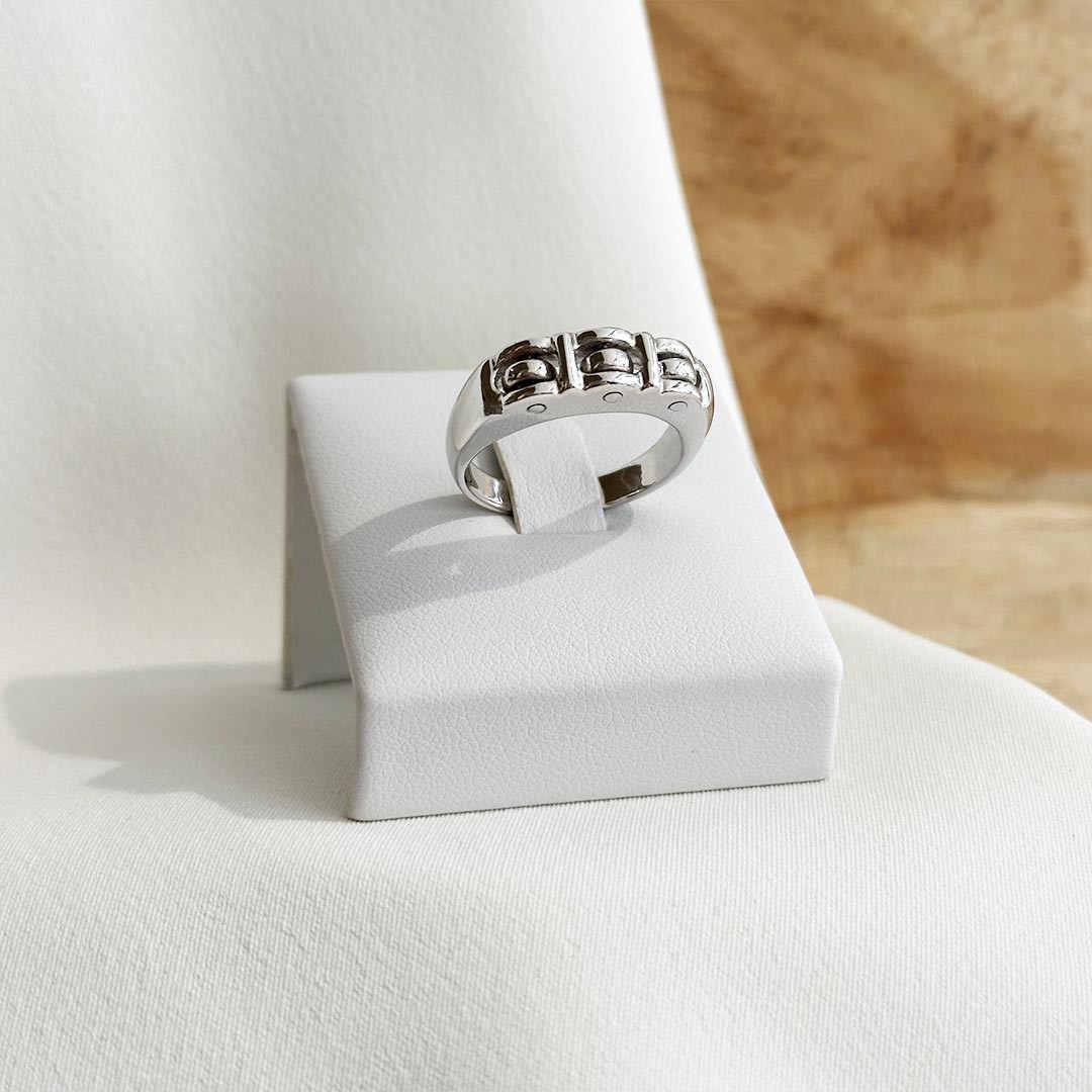 Dieser elegante Ring aus 585 Weißgold besticht durch sein schlichtes Design mit einem raffinierten, verspielten Detail. Oben mittig sind drei kleine Ösen eingearbeitet, die sich sanft bewegen lassen. Auf den ersten Blick wirkt der Ring klassisch und zurückhaltend, doch beim näheren Hinsehen offenbart sich sein besonderer Charme. Ein stilvolles Schmuckstück für alle, die zeitlose Eleganz schätzen – mit einem Hauch Individualität. Ideal für Damen, die das Besondere lieben, ohne auf Zurückhaltung zu verzichten.