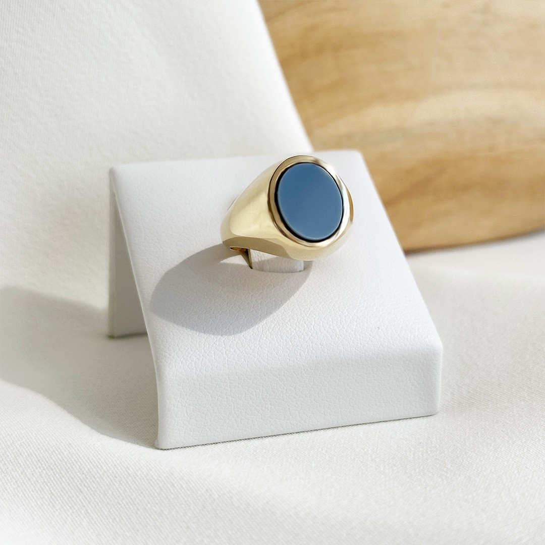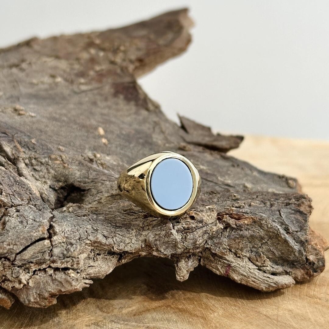 Dieser Goldring aus 585 Gelbgold ist mit einem hellblauen Lagenstein in der Größe 10x9mm besetzt und wurde speziell für den kleinen Finger gefertigt – aktuell ist er in Weite 48 lagernd. Der warme Goldton bildet einen schönen Kontrast zum zarten Blau des Steins, wodurch der Ring eine ruhige, elegante Ausstrahlung erhält. Ohne Gravur getragen, überzeugt er durch seine schlichte Form und die harmonische Farbgebung. Ein klassischer Herrenring mit besonderem Charakter – ideal als persönliches Schmuckstück mit Bedeutung, das dezent getragen wird und durch seine schlichte Gestaltung vielseitig kombinierbar ist.