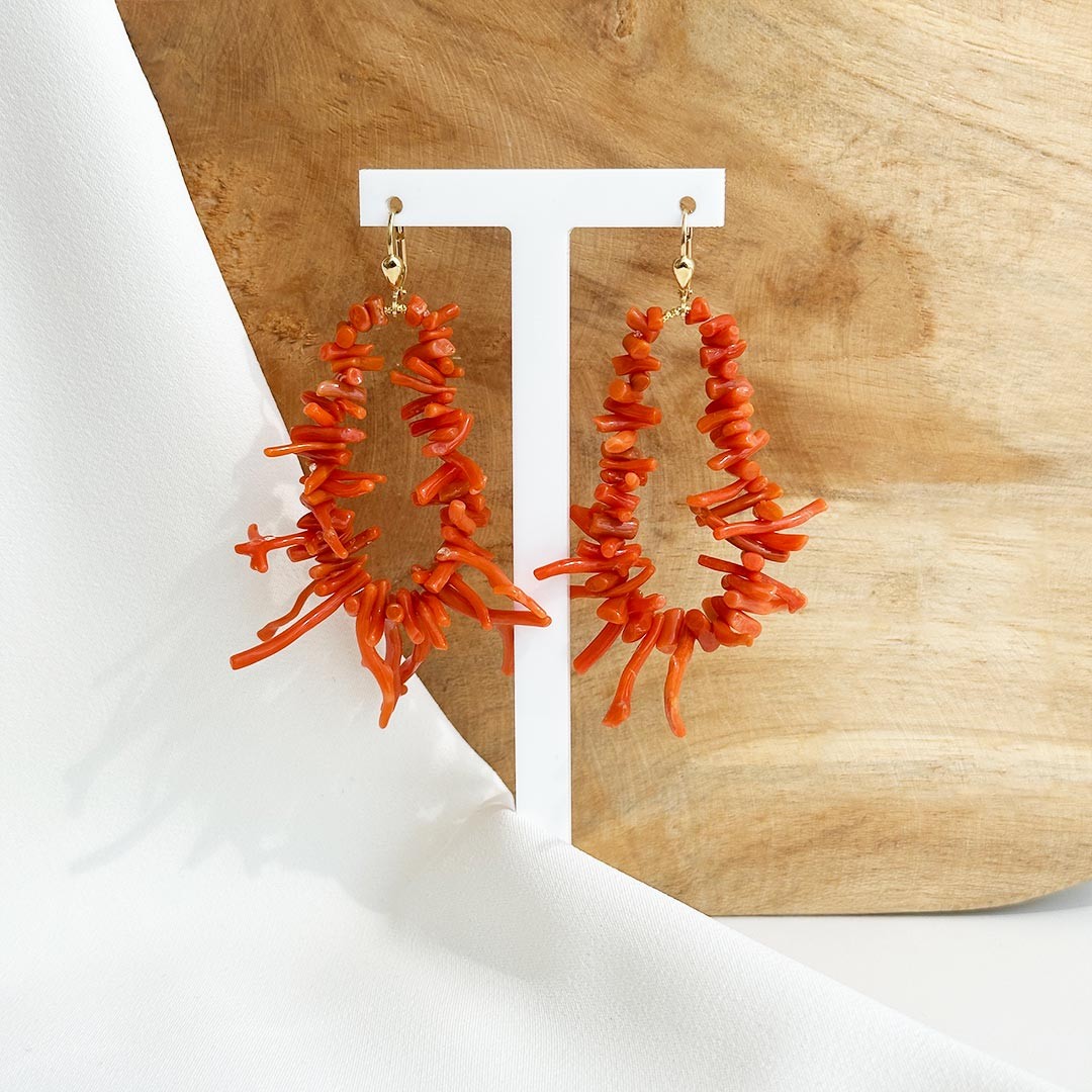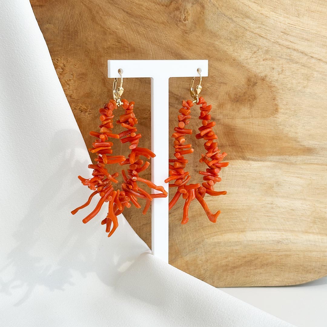 Diese Korallenohrringe vereinen natürliche Leichtigkeit mit einer feinen Eleganz. Auf Draht gefädelte Korallenäste in unterschiedlicher Länge und Stärke bilden ein lebendiges Design: Nach unten hin werden die Äste etwas größer, während sie nach oben hin kleiner auslaufen. Der Ohrschmuck ist mit klassischen Brisuren gearbeitet – angenehm zu tragen und sicher im Halt. Die intensiv rote Farbe der Koralle zieht den Blick auf sich, ohne aufdringlich zu wirken. Ein besonderes Paar Ohrringe, das sich sowohl zu sommerlich-leichten als auch zu eleganten Outfits kombinieren lässt – saisonunabhängig und stilvoll.