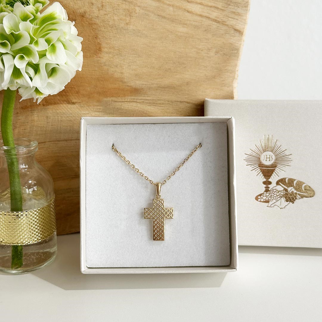 Dieser Kreuzanhänger aus 585 Gelbgold hat eine markante und dennoch unaufdringliche Ausstrahlung. Die obere Fläche ist mit einem polierten Gitterdesign versehen, das dem Kreuz eine interessante Textur und Tiefe verleiht. Das offene Design macht es auffallend, aber dennoch dezent, ideal für besondere Anlässe wie die Erstkommunion. Ein modernes, einzigartiges Schmuckstück, das das Glaubenssymbol auf elegante Weise zur Geltung bringt. Passende Ketten haben wir in unterschiedlichen Längen direkt im Geschäft gelagert.