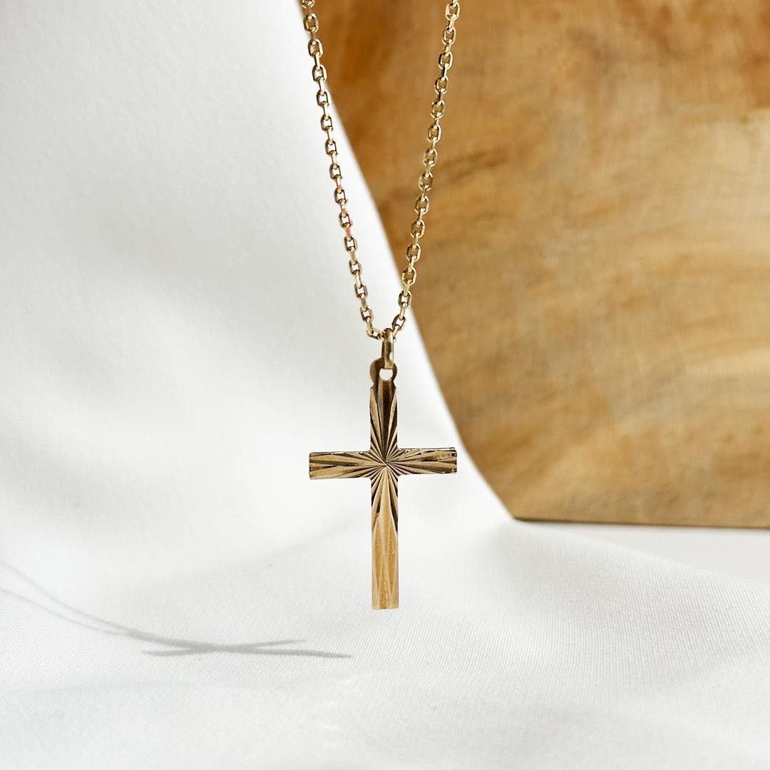 Dieses Kreuz besteht aus 585er Gelbgold und beeindruckt mit einer schlichten Formgebung und raffinierten Verzierungen. Die Oberfläche des Kreuzes besteht aus glänzenden, polierten Verzierungen, die bei Lichteinfall funkelnde Akzente setzen. Es ist eine hervorragende Geschenkauswahl für religiöse Anlässe wie die Erstkommunion oder Firmung sowie für besondere Geburtstage. In unserem Sortiment finden Sie auch die passende Goldkette um das Kreuz stilvoll zu vervollständigen. Die Größe dises Anhängers beträgt ca. 26mm.