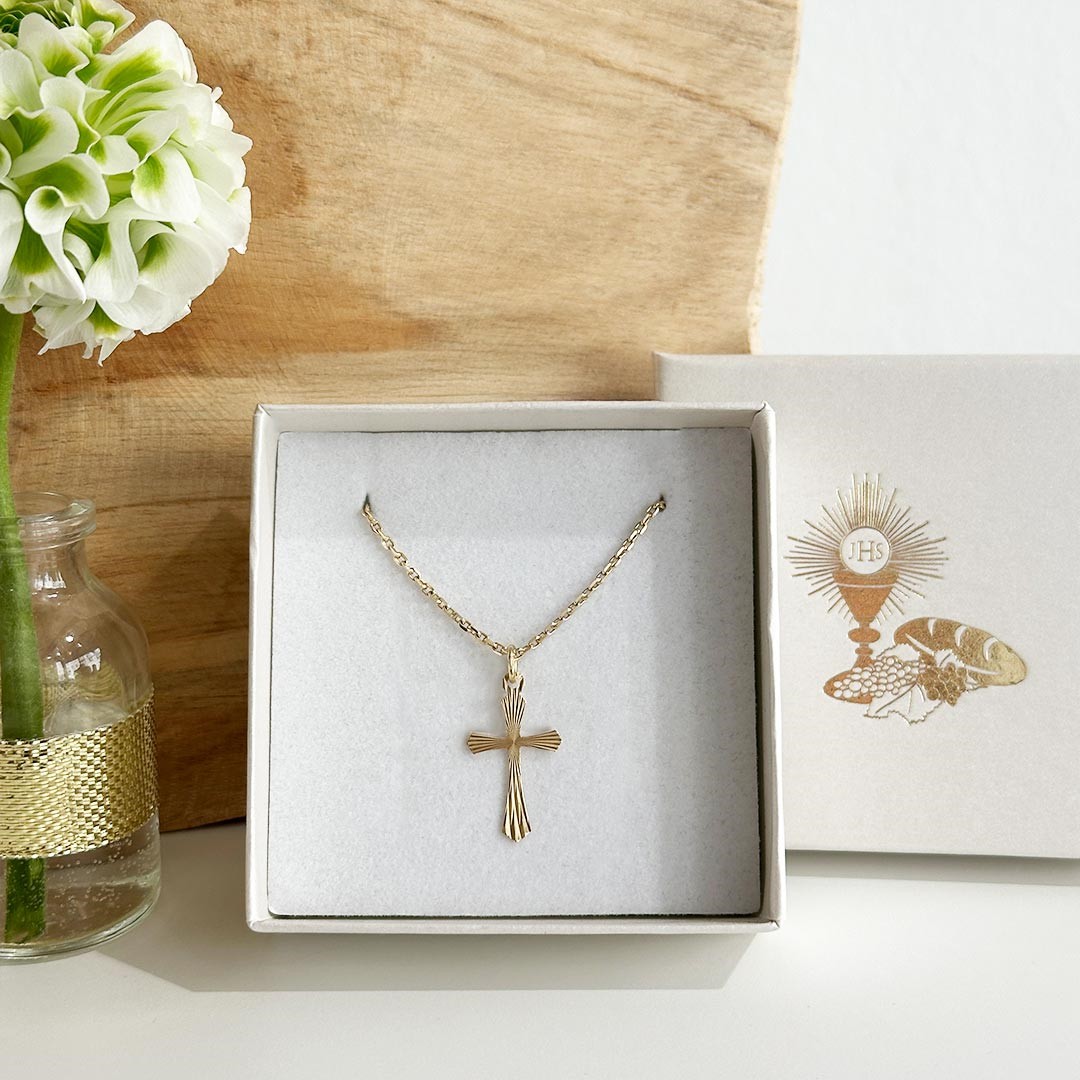 Dieser zarte Kreuz Anhänger aus 585 Gelbgold mit einer Größe von 15mm eignet sich ideal als Geschenk zu einem besonderen Anlass wie beispielsweise zum Geburtstag, zur Heiligen Taufe, zur Erstkommunion oder zur Firmung. Besonders schön ist die polierte Oberfläche des Anhängers. Unsere Goldkreuze können auch wunderbar mit anderen Schmuckanhängern – wie beispielsweise einer Gravurplatte – kombiniert werden. Für Babys und Kinder empfehlen wir die Kettenlängen 36cm bis 42cm. Die Verlinkung zu unseren Kinder-Goldketten finden Sie gleich unterhalb der Produktbilder. Sollten Sie eine andere Kettenlänge oder Kettenart wünschen, stehen wir Ihnen gerne zur Verfügung.