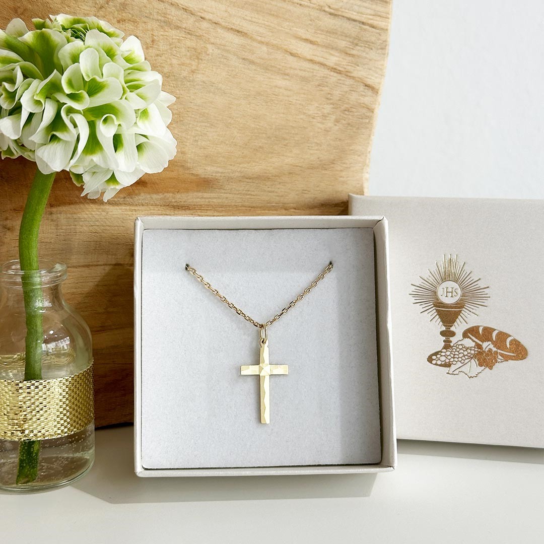 Dieser 585 Gelbgold Kreuz Anhänger hat eine Größe von 20mm und eignet sich wunderbar als Geschenk zum Geburtstag, zur Erstkommunion oder zur Firmung. Besonders schön ist die gehämmerte Oberfläche des Anhängers. In unserem Sortiment finden Sie selbstverständlich auch eine große Auswahl an Goldketten in unterschiedlichen Längen und Stärken.