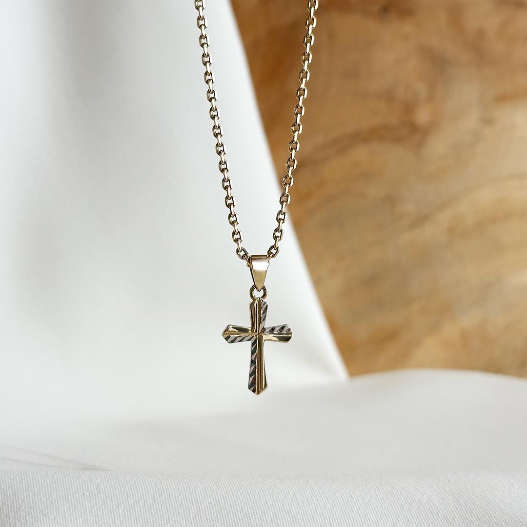 Dieser Kreuzanhänger aus 585er Weiß- und Gelbgold verbindet klassische Schlichtheit mit raffiniertem Detail. Der Hauptteil des flach gearbeiteten Kreuzes besteht aus poliertem Gelbgold, während die diagonale Linie in dezent strukturiertem Weißgold ausgeführt ist. Diese besondere Oberfläche bricht das Licht auf feine Weise und erzeugt einen edlen Schimmer, der an den Glanz von Edelsteinen erinnert – ganz ohne Besatz. Mit einer Größe von 16 mm ist der Anhänger zierlich, aber wirkungsvoll und setzt ein stilvolles, zurückhaltendes Zeichen. Ein Schmuckstück, das durch seine klare Form und die harmonische Zweifarbigkeit überzeugt.