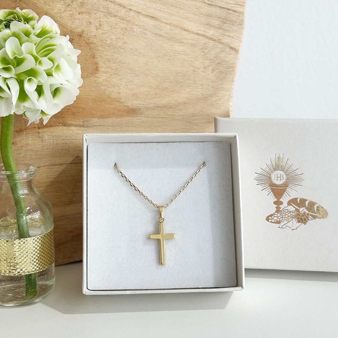 Dieser klassische Kreuzanhänger aus 585er Gelbgold besticht durch seine schlichte Eleganz und polierte Oberfläche. Die Größe des Kreuzes beträgt 18mm. Dank seines zeitlosen Designs lässt er sich wunderbar mit weiteren Schmuckstücken kombinieren, beispielsweise mit einer Gravurplatte. Perfekt als Geschenk zur Taufe oder Erstkommunion und ideal zum Tragen einer feinen Goldkette. Passende Ketten haben wir in unterschiedlichen Längen im Geschäft gelagert. Für Babys und Kleinkinder empfehlen wir eine Länge von 36cm. Ab der Erstkommunion eignet sich eine Kettenlänge von 38 bis 42cm, je nach Größe des Kindes.