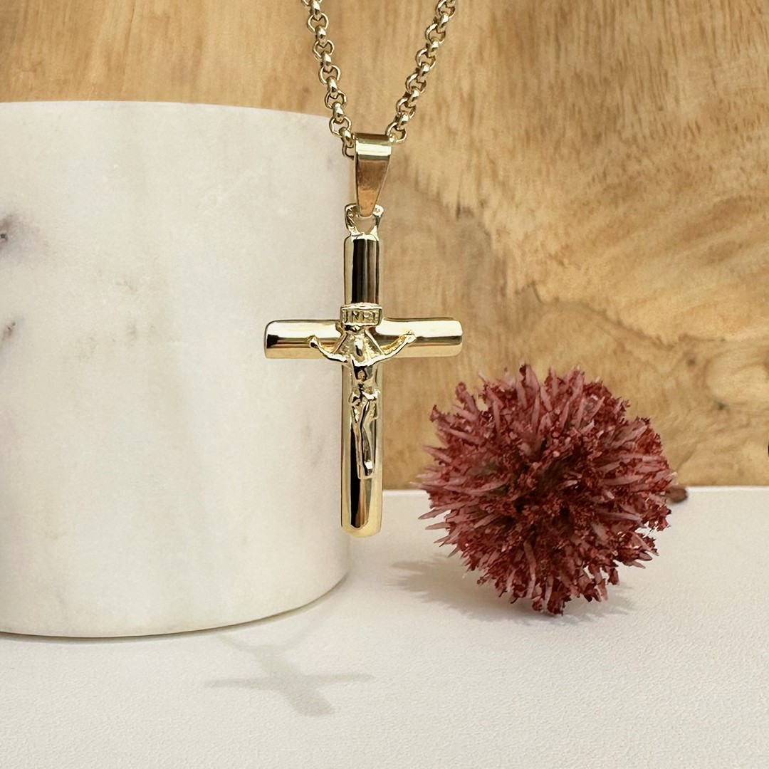 Dieses Goldkreuz mit Korpus aus 585er Gelbgold besticht durch seine präzise Verarbeitung und sein klassisches Design. Dieses hochglanzpolierte Symbol des Glaubens eignet sich hervorragend als Geschenk zu besonderen Anlässen wie Geburtstagen, Erstkommunionen oder Firmungen. Selbstverständlich bieten wir auch eine passende Goldkette für diesen Anhänger in unserem Sortiment an. Mit einer Größe von ca. 25mm ist dieses Kreuz präsent und dennoch angenehm zu tragen – ein Ausdruck von Glaube und Schönheit in einem. Tragen Sie diesen Anhänger stolz und lassen Sie sich von seiner symbolischen Tiefe berühren.