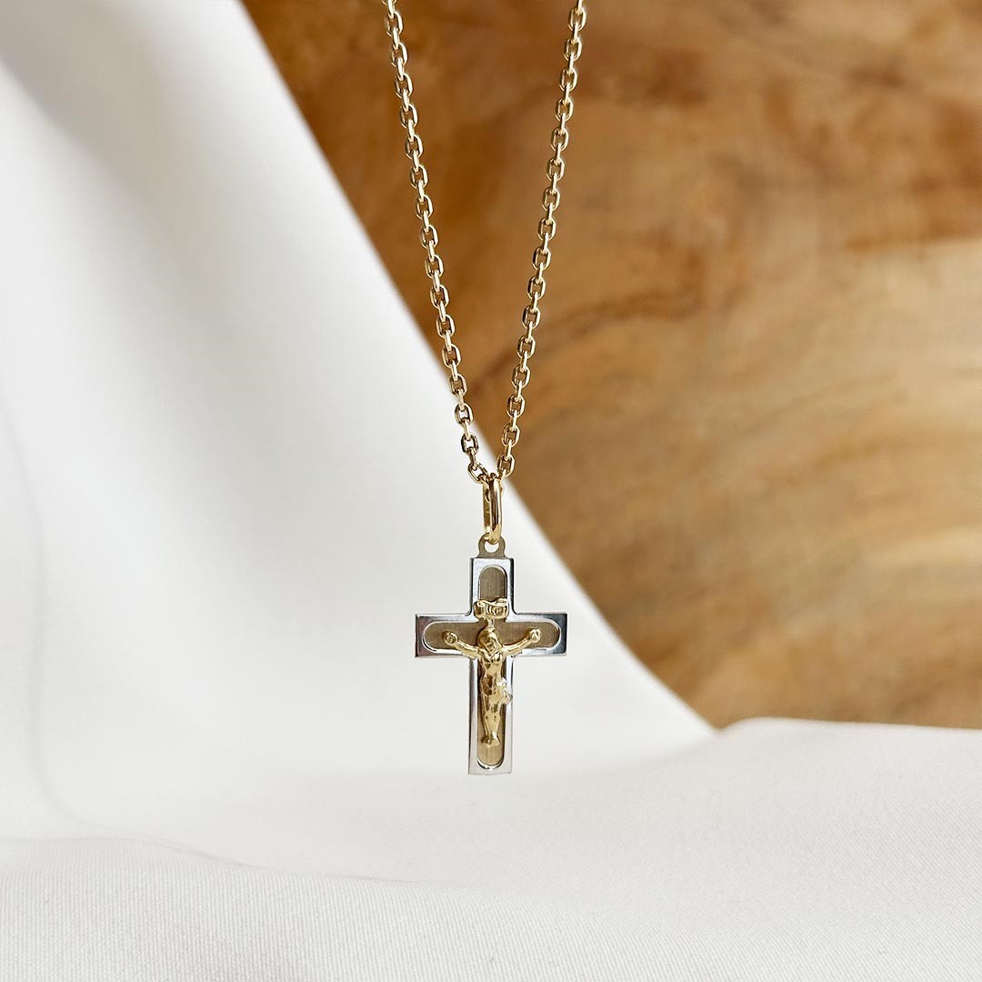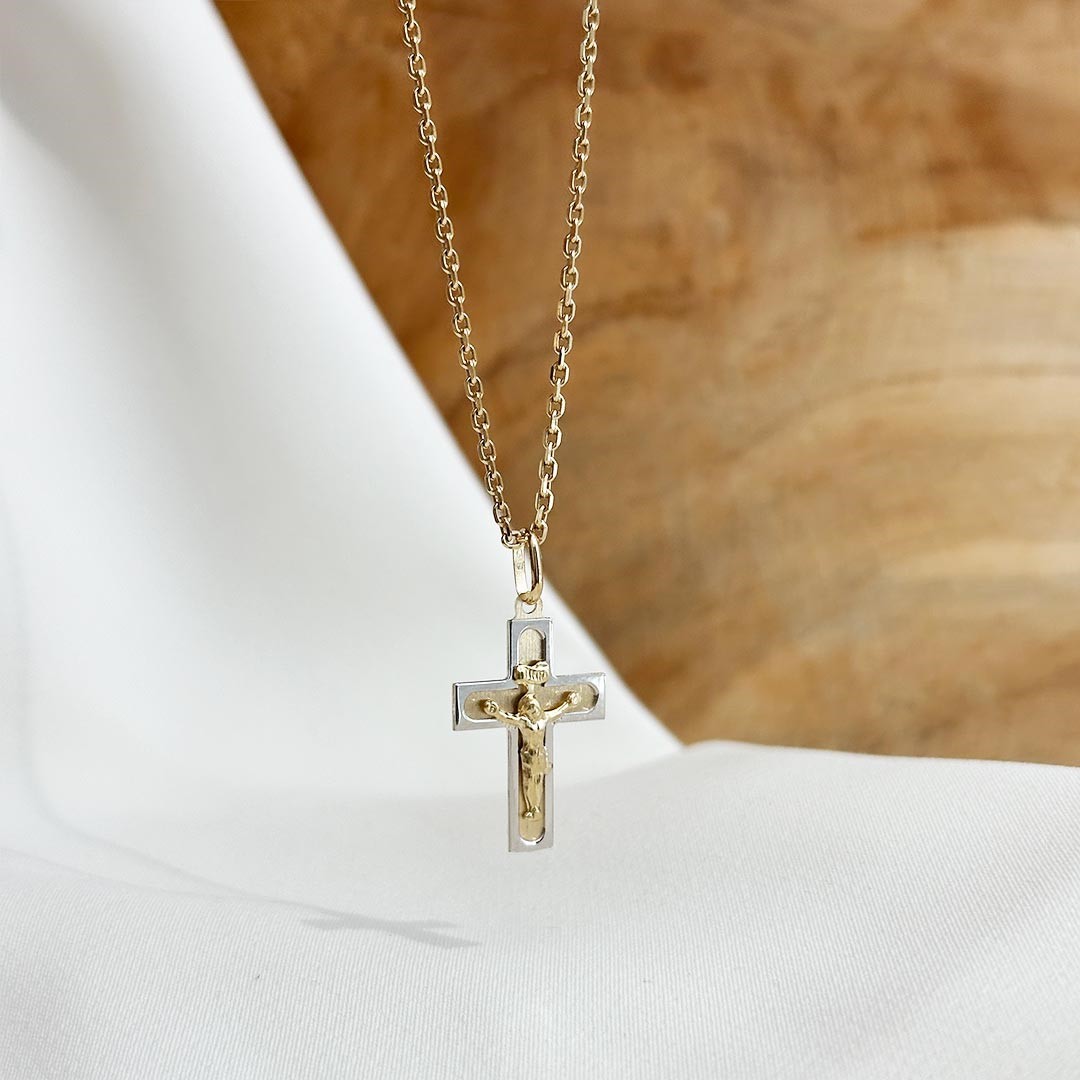 Dieser Kreuzanhänger mit Korpus ist aus 585er Gold in Bicolor-Optik gefertigt und zeigt eine fein ausgearbeitete Darstellung in Gelb- und Weißgold. Die plastische Gestaltung des Korpus hebt sich wirkungsvoll vom Kreuz ab und verleiht dem Schmuckstück Tiefe und Ausdruck. Ein klassischer Anhänger für besondere Anlässe wie Taufe, Firmung oder Kommunion – aber auch als tägliches Symbol des Glaubens. Die harmonische Verbindung der beiden Goldtöne unterstreicht den Kontrast auf elegante Weise. Passende Goldketten in verschiedenen Längen und Stärken finden Sie ebenfalls in unserem Sortiment.