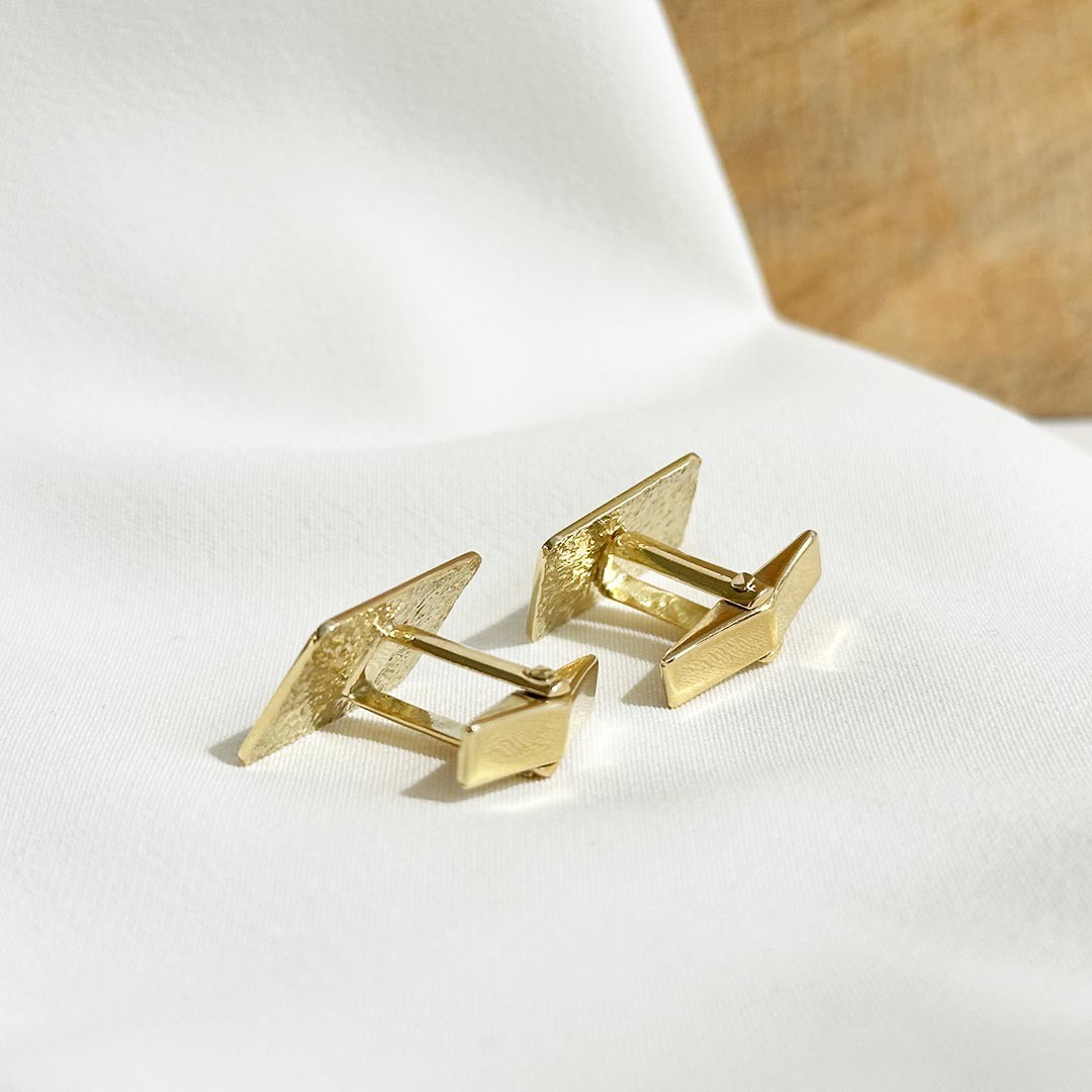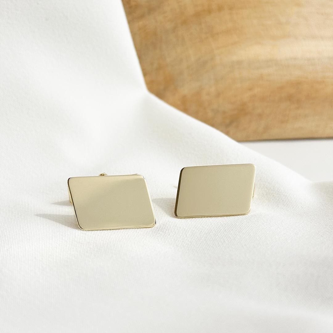 Unsere eckigen Manschettenknöpfe aus 585er Gelbgold bestechen durch ihre klassische, polierte Oberfläche. Der warme Goldton strahlt zeitlose Eleganz aus und sorgt für einen stilvollen Auftritt. Dank der schlichten, glatten Fläche eignen sie sich ideal für individuelle Gravuren – sei es Initialen, ein besonderes Datum oder ein persönliches Symbol. Diese Manschettenknöpfe sind ein hochwertiges Accessoire für besondere Anlässe wie Hochzeiten, Jubiläen oder festliche Events. Machen Sie diese goldenen Manschettenknöpfe zu einem unverwechselbaren Highlight. Ein Must-have für jeden Gentleman, der Wert auf Eleganz und Stil legt. Die Größe der Platte beträgt 12x18mm.