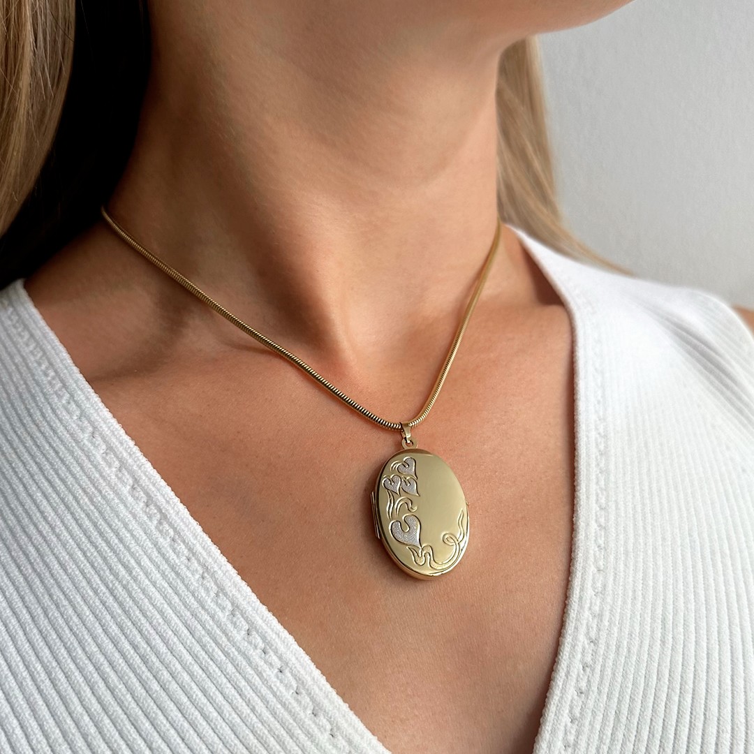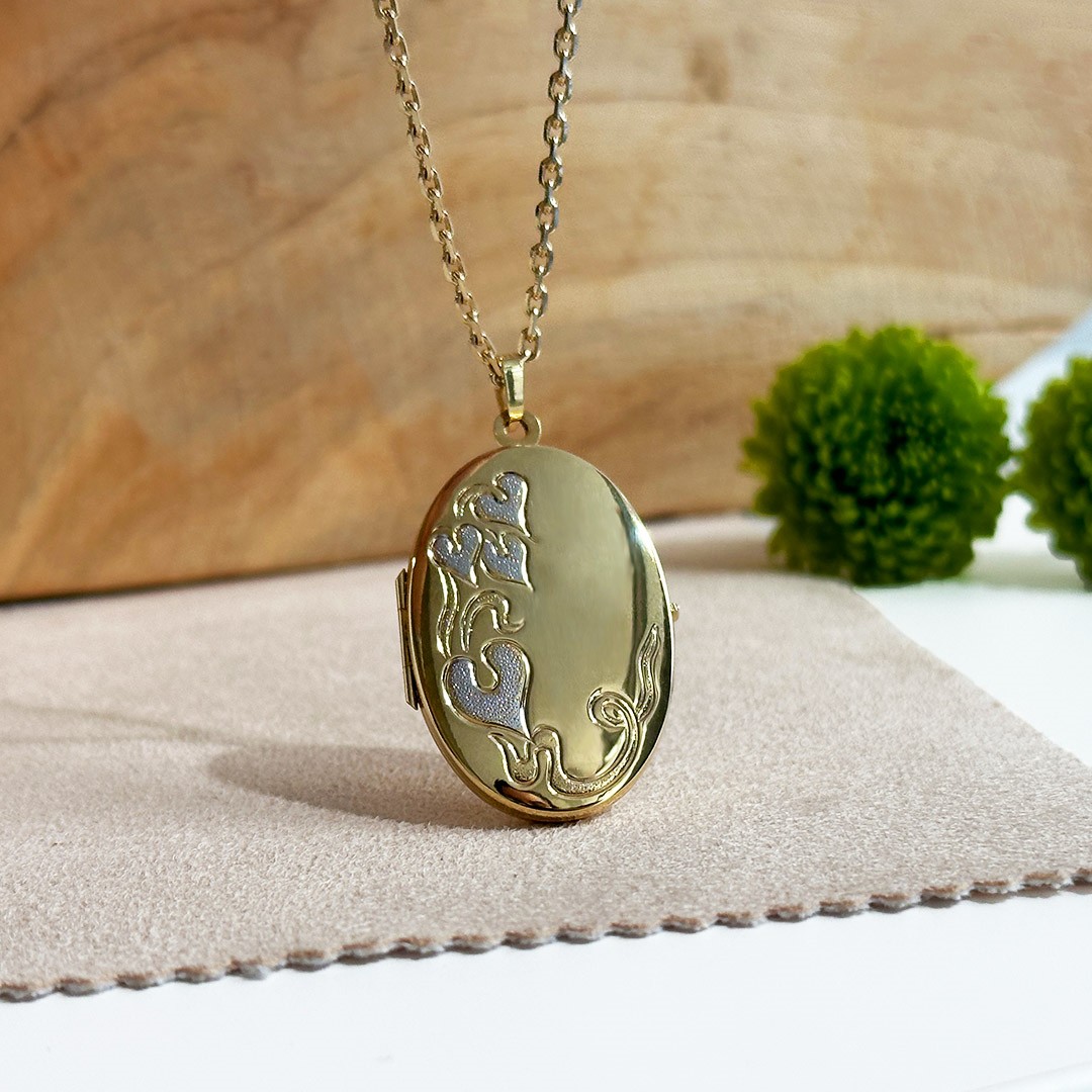 Das 585 Gold Medaillon ist mit Herzen verziert und eignet sich wunderbar als Geschenk für besondere Anlässe und Momente, die im Herzen verankert bleiben sollen. Die liebliche Verzierung strahlt Wärme und Liebe aus. Das Medaillon lässt sich seitlich öffnen und bietet somit die Möglichkeit, zwei Erinnerungsfotos an magische Momente oder geliebte Menschen darin aufzubewahren. Für eine persönliche Note übernehmen wir gerne kostenlos das Einsetzen Ihres Lieblingsfotos. Dieses ovale Medaillon ist ein kostbares Schmuckstück, das die Erinnerungen und Emotionen in sich trägt und bei jedem Blick darauf eine ganz besondere Bedeutung entfaltet. Die Größe des Medaillon Anhängers beträgt 35mm. Passende Goldketten in unterschiedlichen Längen und Stärken finden Sie ebenfalls in unserem Sortiment.