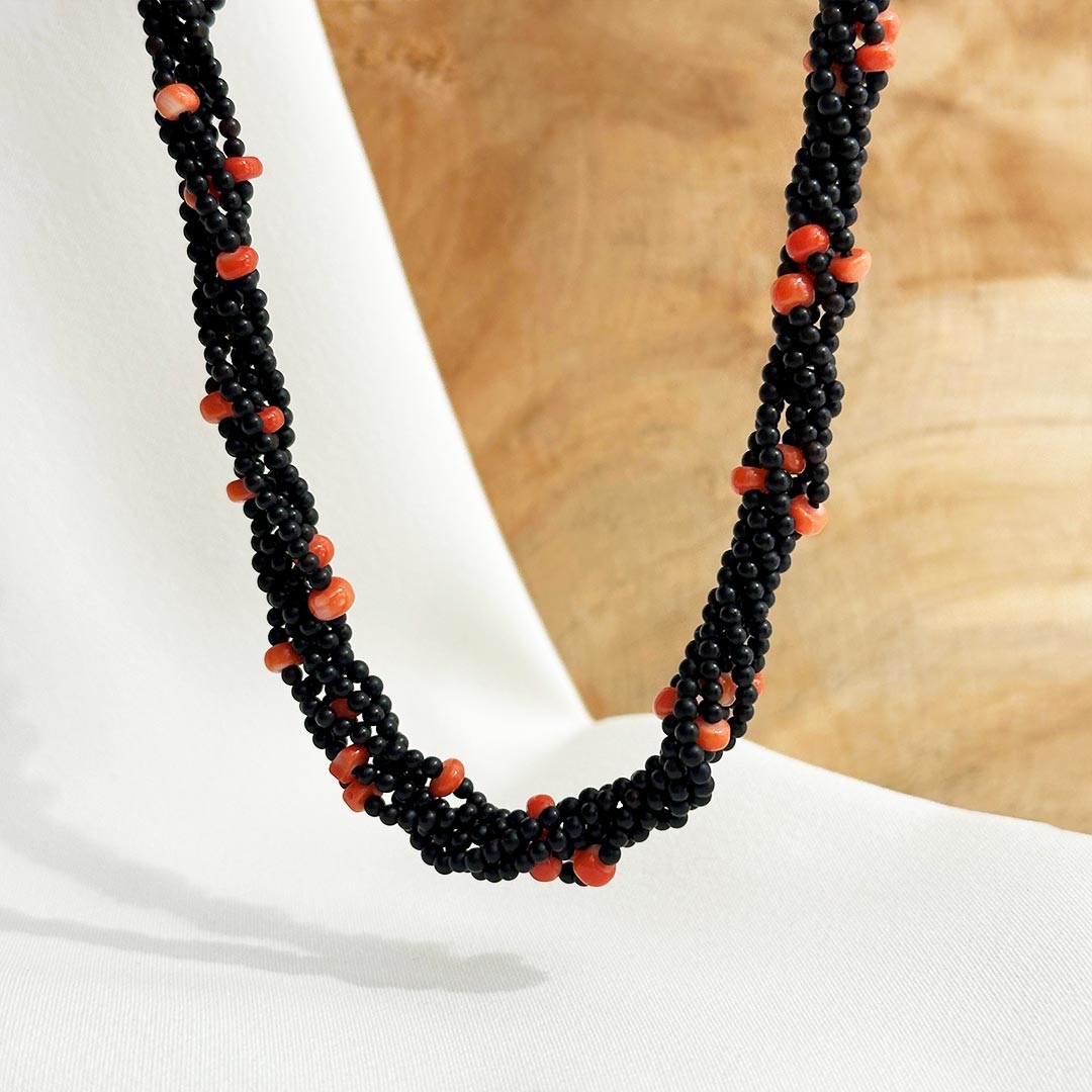 Die mehrreihige Kette ist eine harmonischen Kombination von schwarzem Onyx und leuchtend roter Koralle, die eine faszinierende Kontrastwirkung erzeugen. Mit einer Länge von 45cm ist dieses Schmuckstück im Geschäft gelagert und bereit, Ihre Schmucksammlung zu bereichern. Ein besonderer Tipp für das Tragen dieses Colliers: Wenn Sie diese mehrreihige Kette vor dem Anlegen leicht eindrehen, kommen die einzelnen Stränge besonders schön zur Geltung. Dies verleiht eine zusätzliche Dimension und unterstreicht die einzigartige Schönheit dieses Schmuckstücks.