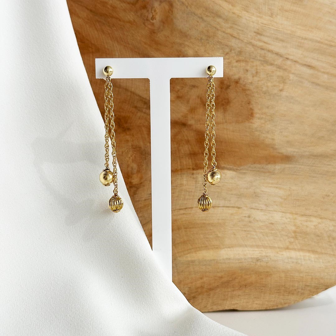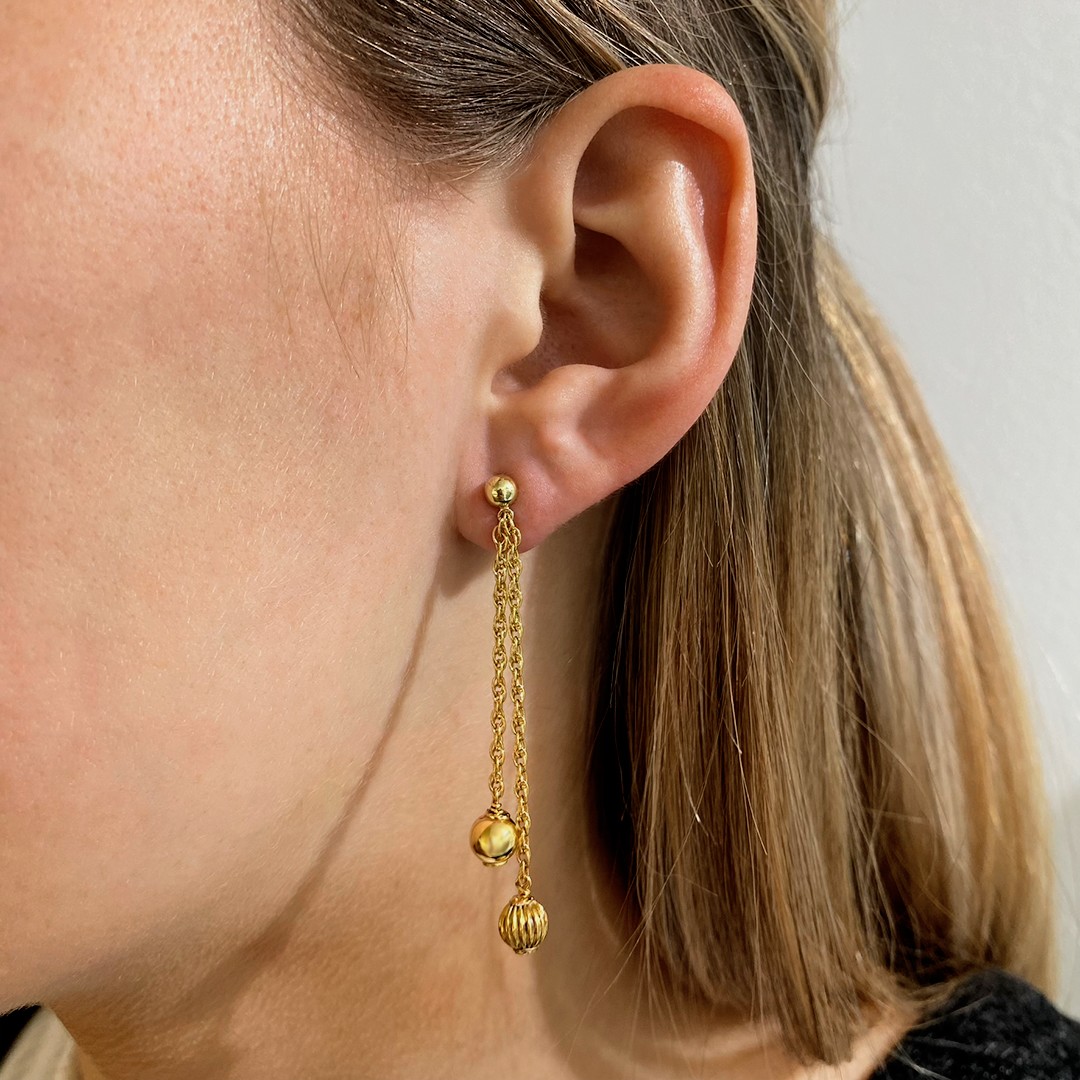 Diese eleganten Goldohrringe aus 585er Gelbgold bestechen durch ihr Design und eine feminine Ausstrahlung. Jeder Ohrring besteht aus zwei feinen Wallisketten, die sanft schwingen und am unteren Ende jeweils mit einer kleinen Goldkugel abgeschlossen sind. Dieses Detail verleiht dem Ohrschmuck eine spielerische Leichtigkeit. Mit ihrer Länge von 55mm wirken die Ohrringe modern und raffiniert – perfekt für alle Frauen, die schlichte Eleganz mit einem Hauch verspieltem Charme verbinden möchten. Ob zu besonderen Anlässen oder als stilvoller Akzent im Alltag – diese Ohrringe passen einfach immer.