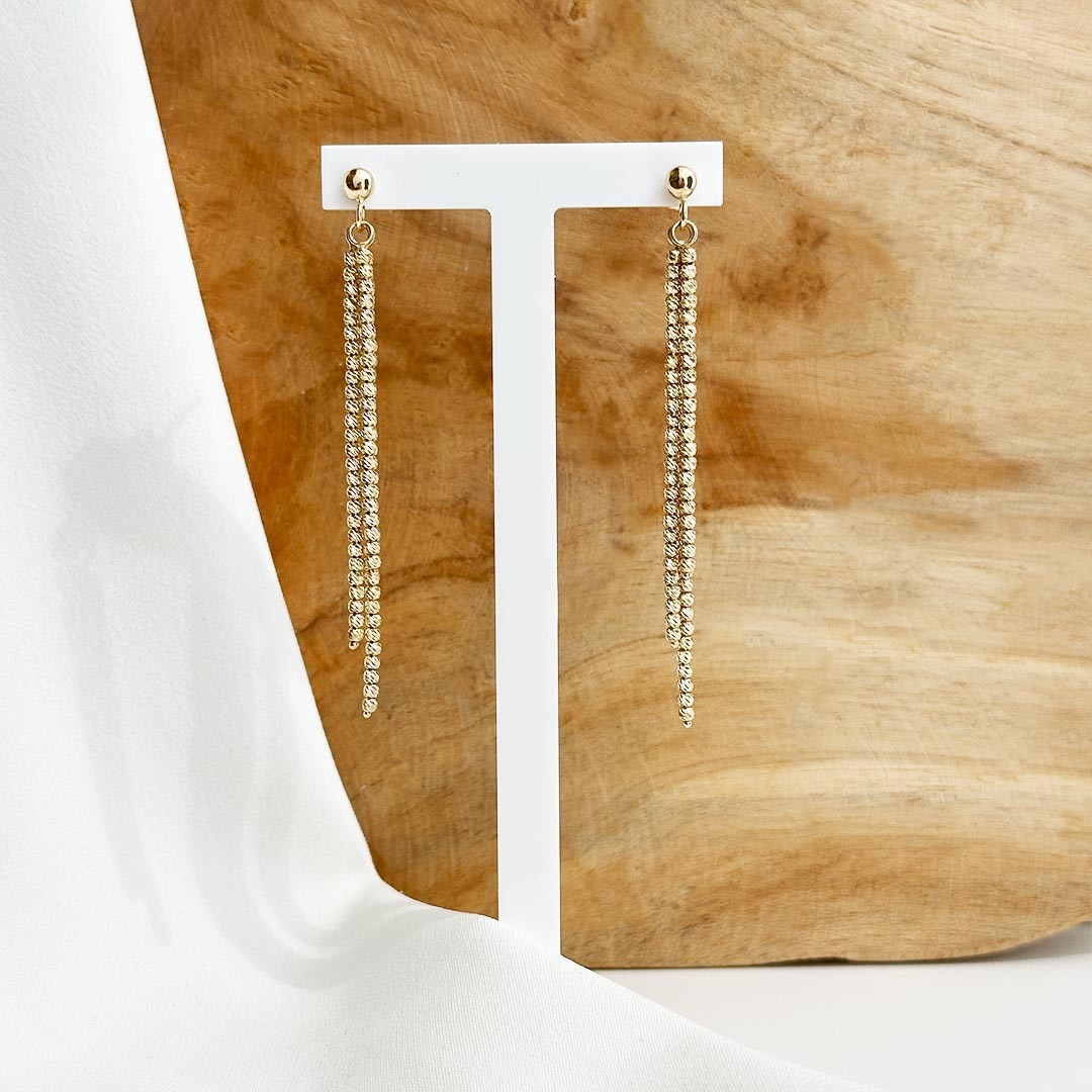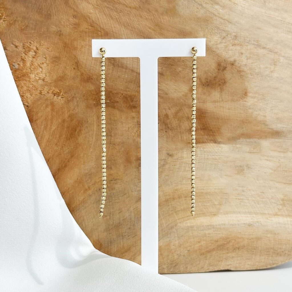 Diese eleganten Ohrstecker aus 585er Gelbgold bestechen durch ihre schlichte und dennoch besondere Gestaltung. Drei feine Kettenstränge mit facettierten Kügelchen sorgen für eine sanfte Bewegung und fangen das Licht bei jeder Bewegung ein, wodurch ein wunderschöner Schimmer entsteht. Dieses Design macht die Ohrringe auch zu einer stilvollen Wahl für besondere Anlässe wie Bälle oder Hochzeiten. Gleichzeitig sind sie dezent genug, um auch im Alltag getragen zu werden, ohne aufdringlich zu wirken. Mit einer Länge von 7cm verleihen sie eine elegante Note und unterstreichen die natürliche Ausstrahlung ihrer Trägerin.