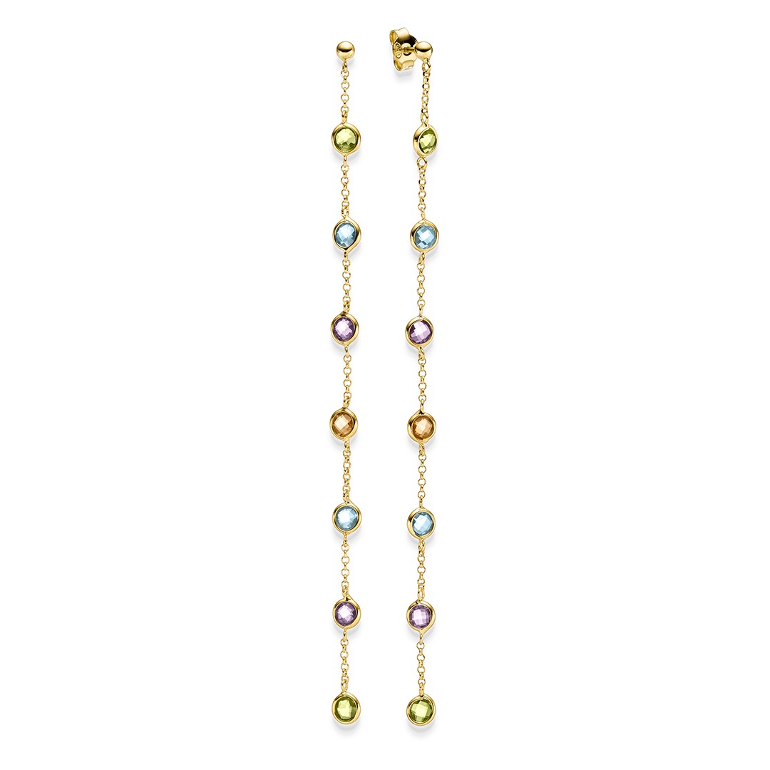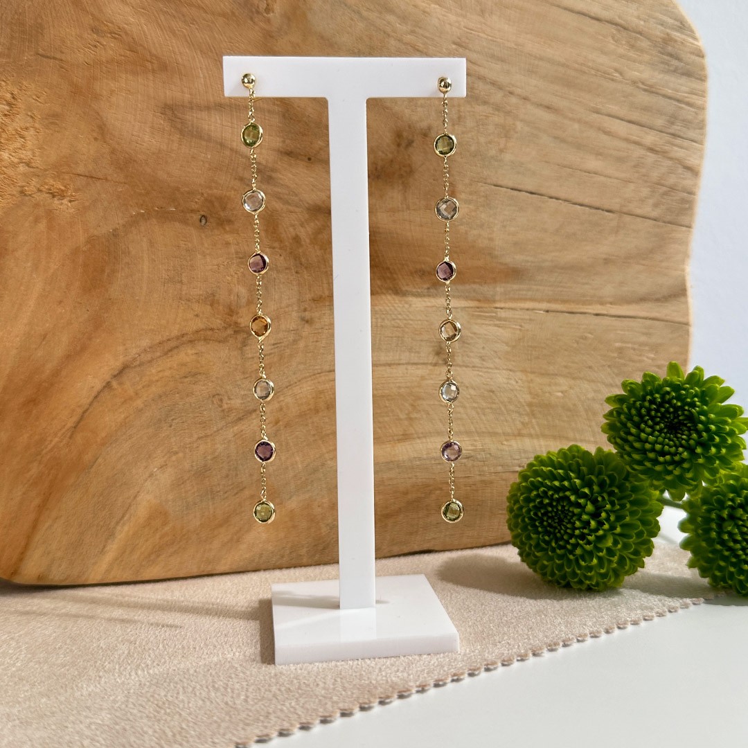 Diese 585 Gelbgold Ohrringe begeistern durch ihre funkelnden Farbedelsteinen: Peridot, Blautopas, Amethyst und Citrin, die untereinander gefasst sind. Diese Ohrringe haben eine Länge von 9cm – die einzelnen Edelsteine haben einen Durchmesser von ca. 4mm. Wenn Sie bunte Farben lieben und dem Anblick funkelnder Edelsteine nicht widerstehen können, werden Sie von diesen Ohrringen begeistert sein.