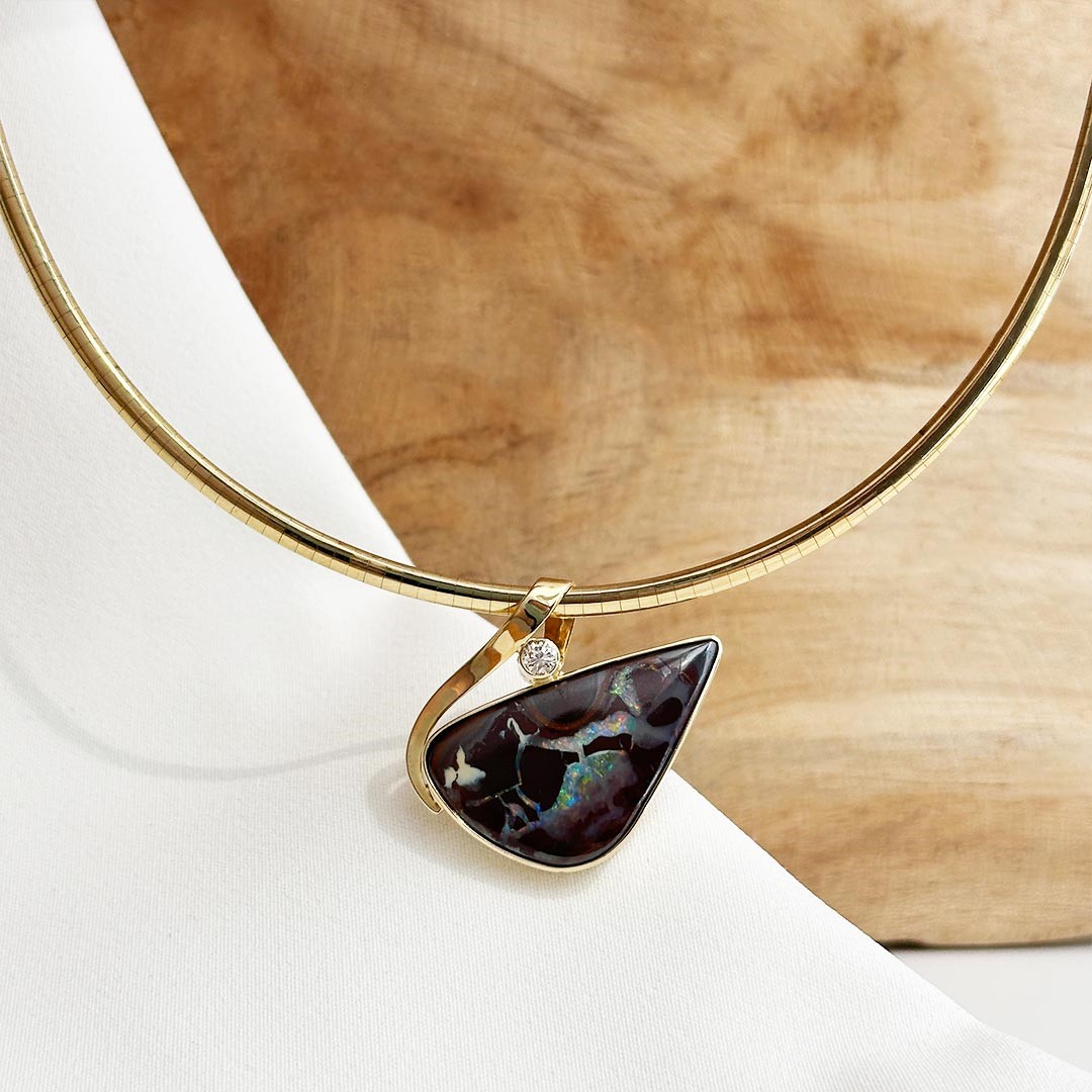 Dieser handgefertigte Anhänger aus 585er Gelbgold zeigt einen Matrix Boulder Opal, der mit seinem lebendigen Farbspiel und der natürlichen Struktur im Mittelpunkt steht. Die schlichte Fassung aus Gold lässt den Opal besonders gut zur Geltung kommen und betont seine einzigartigen Muster. Eine zarte Schlaufe dient als Verbindung zur Kette oder einem Halsreif und verleiht dem Design eine leichte, verspielte Note. Ein kleiner Brillant ergänzt das Schmuckstück mit einem dezenten Funkeln und schafft einen schönen Kontrast zum farbenreichen Opal. Ein besonderer Anhänger für alle, die das Außergewöhnliche suchen.