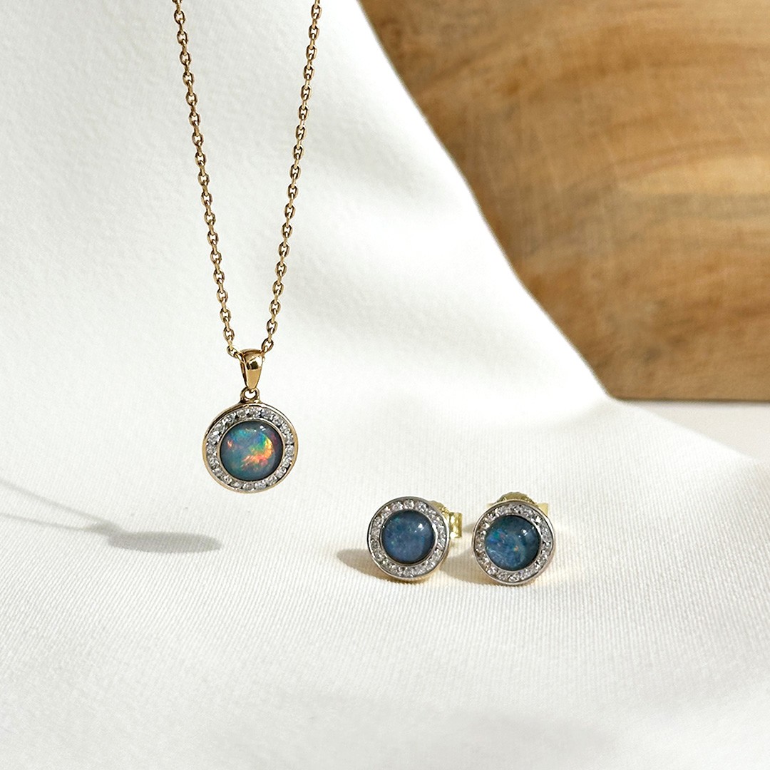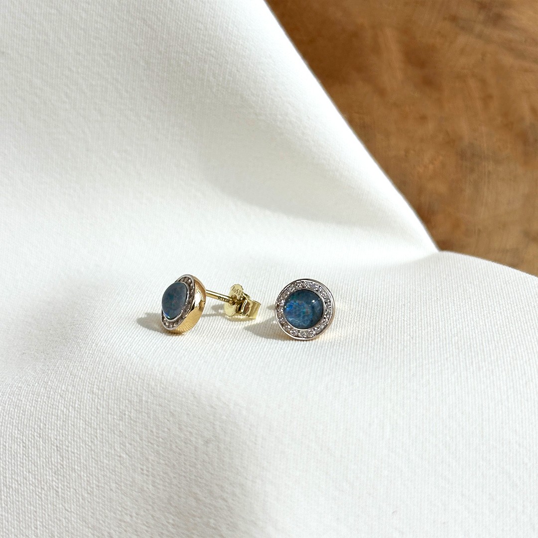 Diese Ohrstecker aus 585er Gelbgold sind mit je einer edlen Opaltriplette besetzt, die durch ihr faszinierendes Farbspiel sofort begeistert. Der runde Stein ist von kleinen, eng gefassten Diamanten umgeben, die dem Schmuckstück ein feines Funkeln verleihen und das Schimmern des Opals stilvoll unterstreichen. Mit einer Größe von 8mm sind die Ohrstecker dezent und dennoch ausdrucksstark – elegant genug für festliche Anlässe und gleichzeitig unaufdringlich für den Alltag. Ein edles Schmuckstück für alle, die Wert auf schlichte Eleganz mit besonderem Detail legen.
