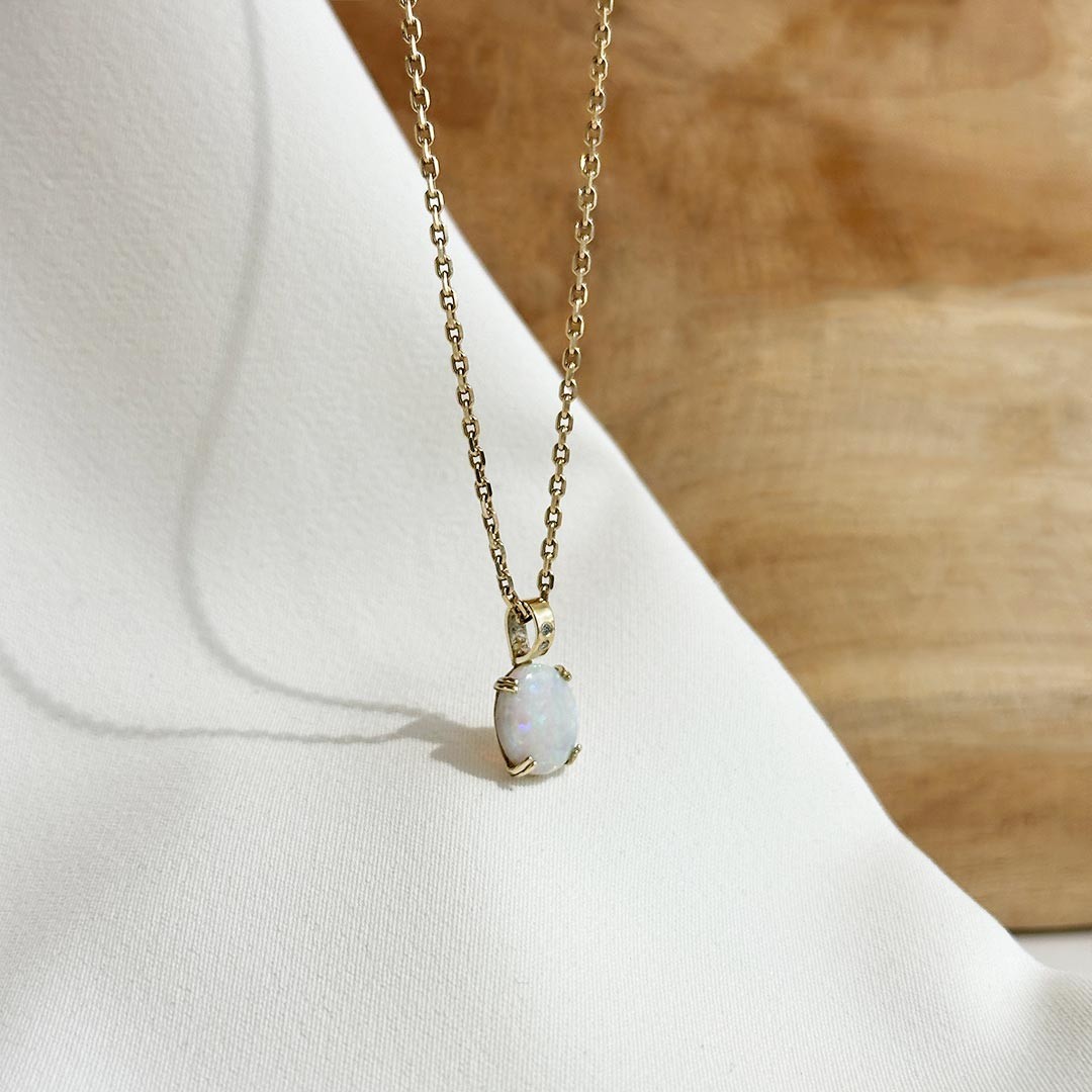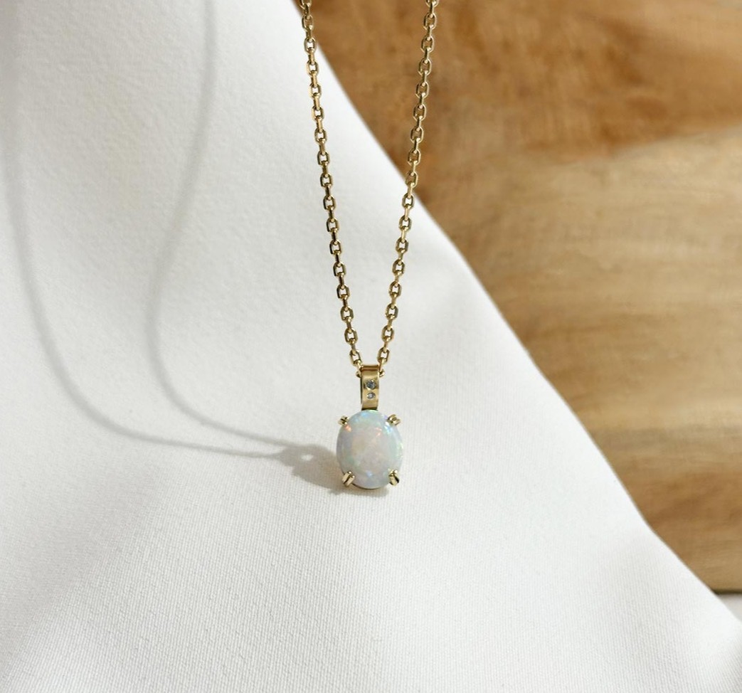 Dieser handgefertigte Anhänger aus 585 Gelbgold fasst einen ovalen Opal in zarten Krappen, die viel Licht an den Stein lassen und so sein charakteristisches Farbspiel – das sogenannte Opalisieren – besonders schön zur Geltung bringen. Mit seiner Größe von 10mm bleibt der Anhänger dezent, zieht aber durch das lebendige Schimmern sofort die Blicke auf sich. Zwei kleine, fein eingefasste Diamanten oberhalb des Steins sorgen für ein zusätzliches Funkeln und verleihen dem Schmuckstück eine elegante Note. Getragen an einer schlichten Karreekette entfaltet der Opalanhänger seine volle Wirkung. Ein feines Geschenk – besonders für Geburtstagskinder im Oktober, denn der Opal gilt als Geburtsstein dieses Monats.