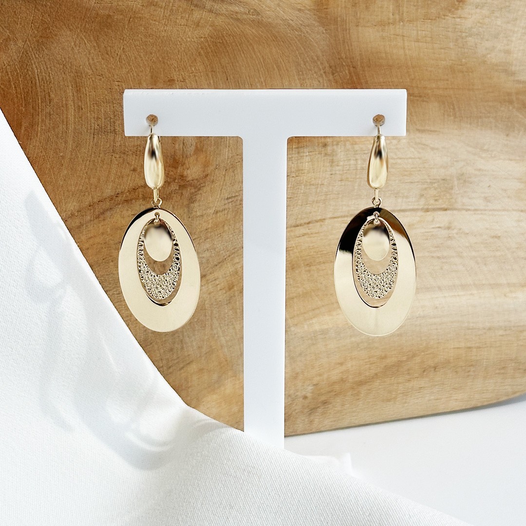 Diese Ohrgehänge aus 585er Gelbgold überzeugen durch ihre elegante Linienführung und eine harmonische Abfolge ovaler Elemente. Mit einer Länge von 42mm zeigen sie sich präsent und dennoch angenehm leicht zu tragen. Der obere Teil ist klassisch gehalten und geht fließend in den unteren Bereich über, der aus mehreren ovalen Formen besteht. Das größte Element ist poliert und verleiht dem Ohrschmuck Ruhe und Klarheit, dazwischen setzt ein fein gearbeitetes, strukturiertes Oval lebendige Akzente, das bei Lichteinfall besonders schön schimmert. Den Abschluss bildet ein kleineres, ebenfalls poliertes Element. Die einzelnen Teile sind leicht beweglich miteinander verbunden, wodurch bei jeder Bewegung eine feine Dynamik entsteht. Trotz ihrer flächigen Gestaltung wirken die Ohrgehänge luftig und ausgewogen und eignen sich wunderbar als stilvoller Begleiter für den Alltag.