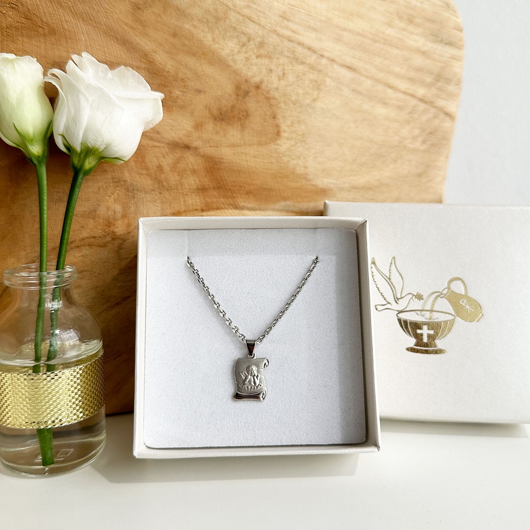 Dieser klassische Schutzengel-Anhänger aus 585er Weißgold ist in Form einer Papyrusrolle gestaltet. Mit seiner Größe von 12mm eignet sich der Anhänger wunderbar als bedeutungsvolles Geschenk zur Taufe, Erstkommunion oder einem anderen besonderen Anlass. Der feine Kontrast zwischen der glänzenden Oberfläche und dem dezent gearbeiteten Engelmotiv verleiht dem Schmuckstück eine ruhige, edle Ausstrahlung. Dank seiner neutralen Gestaltung ist der Anhänger sowohl für Mädchen als auch für Jungen geeignet. Auf der Rückseite bietet der Anhänger Platz für eine kurze persönliche Gravur.