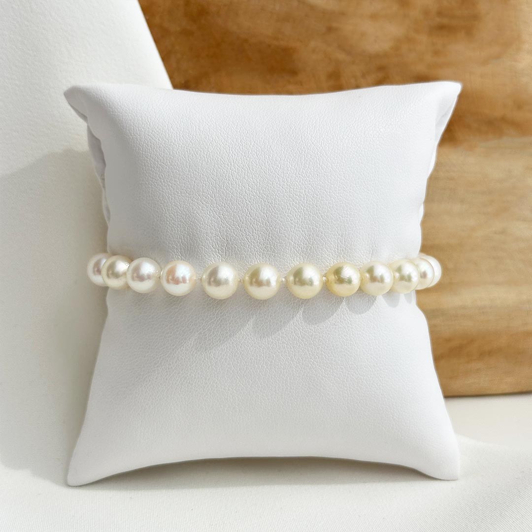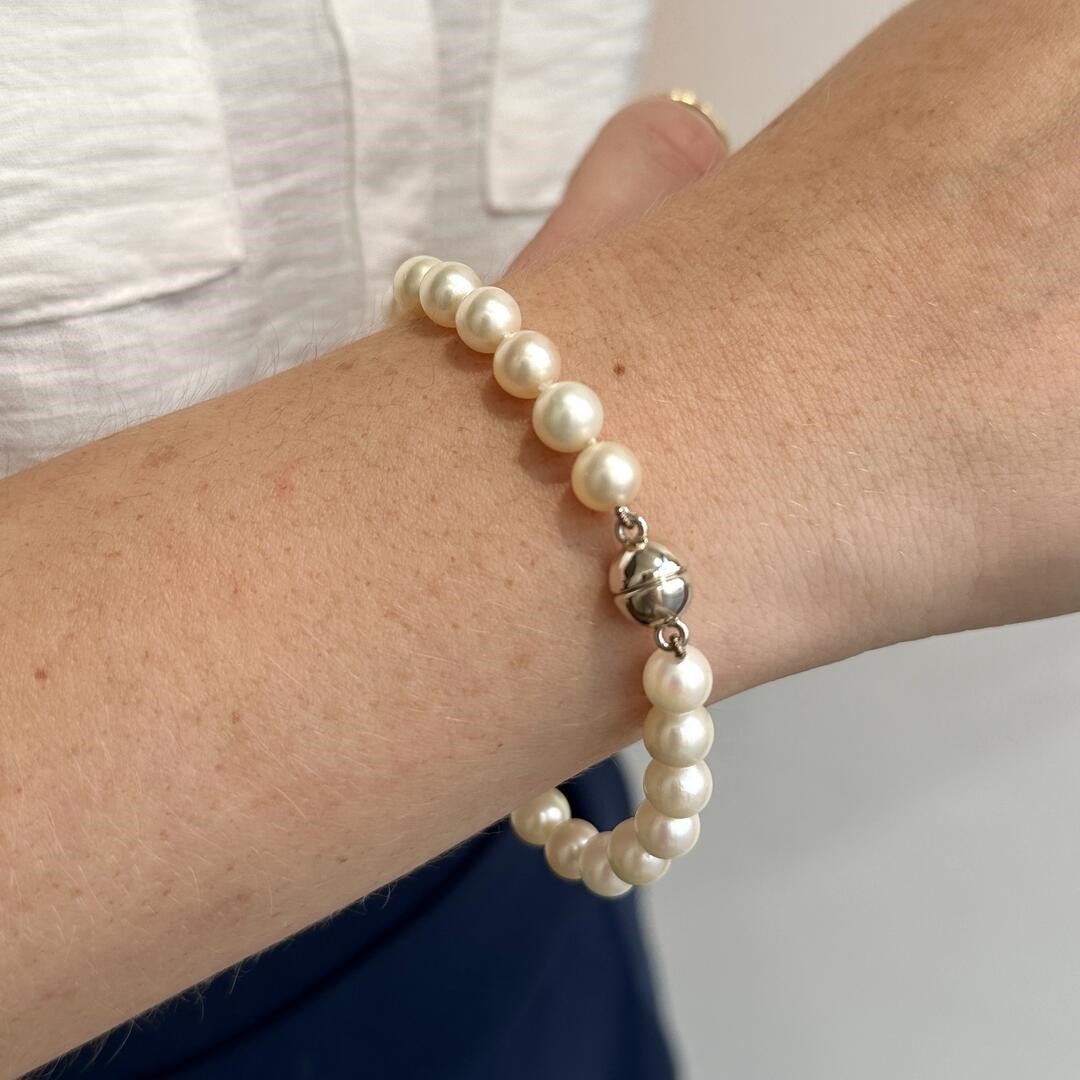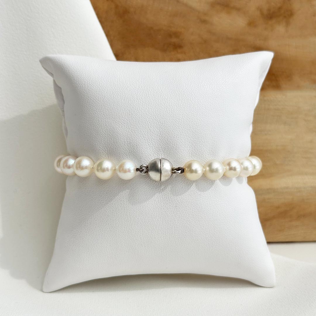 Dieses klassische Perlenarmband ist mit 8mm großen Akoya-Perlen gearbeitet und vereint zeitlose Eleganz mit alltagstauglichem Tragekomfort. Die feinen Perlen zeichnen sich durch ihren natürlichen Lüster und ihre gleichmäßige Form aus – ein Armband, das dezent wirkt und dennoch Präsenz zeigt. Dank der praktischen Magnetschließe aus 925 Silber lässt es sich besonders leicht anlegen und bleibt dabei sicher am Handgelenk. Mit seiner Länge von 18cm ist es ideal proportioniert und lässt sich wunderbar auch mit schlichten Goldarmbändern kombinieren. Ein stilvolles Stück für jeden Tag.