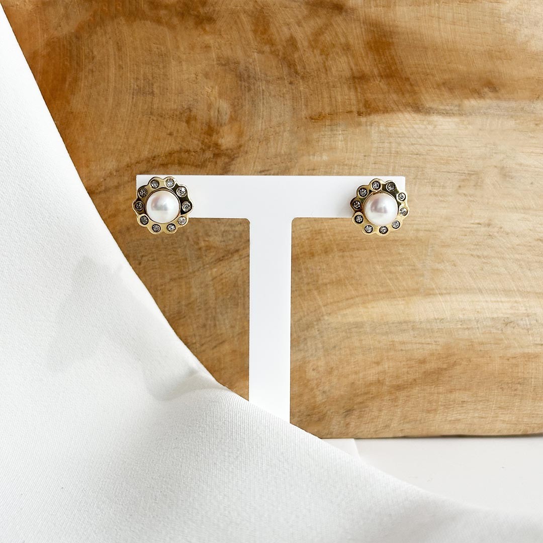 Diese Perlenohrstecker, gefertigt aus 585er Gelbgold, sind etwas Besonderes. Die Goldumrandung um die Süßwasserperle ist mit kleinen Brillanten besetzt. Dies schafft einen harmonischen Kontrast zwischen dem warmen Goldfarbton, der Glanz der Perle und dem Funkeln der Brillanten. Für Liebhaberinnen klassischer Eleganz mit einem Hauch von Extravaganz. Diese Ohrstecker lassen sich vielseitig kombinieren, sei es mit einem Goldcollier, einer Goldkette oder einer klassischen Perlenkette aus unserem Sortiment.