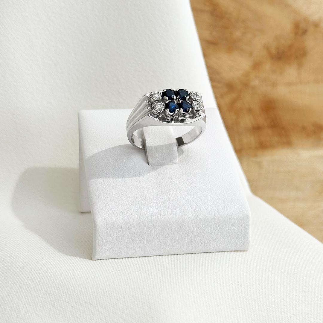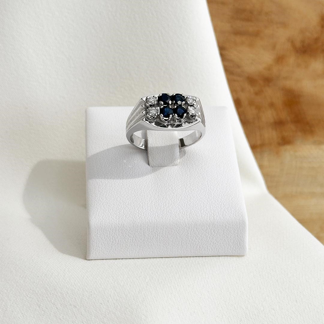 Dieser Ring aus 585er Weißgold besticht durch seine klare Linienführung und die markante, leicht eckige Form, die ihm eine moderne und doch zeitlose Wirkung verleiht. Die Kombination aus vier tiefblauen Saphiren und vier funkelnden Brillanten ist harmonisch aufeinander abgestimmt und bildet ein stilvolles Zusammenspiel von Farbe und Licht. Das kühle Weißgold bildet dabei die ideale Basis und lässt die Edelsteine besonders zur Geltung kommen. Ein Ring, der durch seine Besonderheit auffällt, ohne aufdringlich zu wirken – perfekt geeignet für den Alltag und zugleich ausdrucksstark genug für besondere Anlässe. In der Ringweite 56 ist dieses Schmuckstück in unserem Geschäft lagernd.