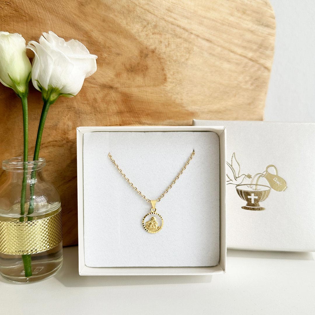 Dieser Schutzengel-Anhänger aus 585 Gelbgold zeigt einen ausgeschnittenen Engel, der scheinbar schwerelos auf einer kleinen Wolke sitzt. Der durchbrochene Hintergrund verleiht dem Schmuckstück eine besondere Leichtigkeit, während der facettierte Rand das Licht dezent einfängt und so für ein edles Funkeln sorgt. Das klassische runde Design macht den Anhänger zu einem zeitlosen Symbol für Schutz und Geborgenheit – ideal als Geschenk zur Geburt, Taufe oder Kommunion. Dank der harmonischen Gestaltung ist dieser Anhänger sowohl für Mädchen als auch Jungen geeignet. Kombinieren Sie ihn mit einer zarten Goldkette in 36cm für Babys und Kinder oder 40 – 45cm ab dem Kommunionsalter.