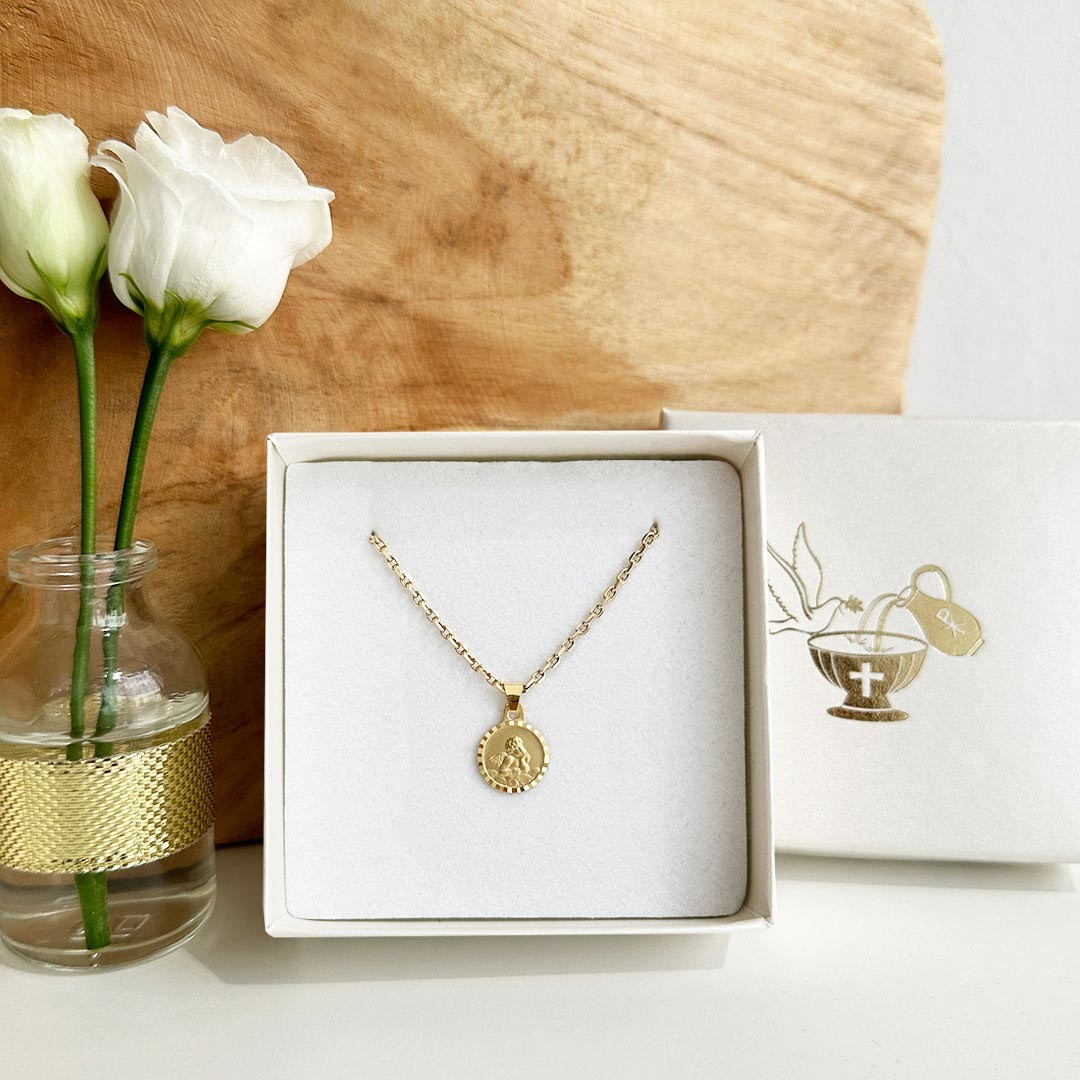 Dieser runde Schutzengel-Anhänger aus 585er Gelbgold beeindruckt durch seinen facettierten Rand, der das Licht aus verschiedenen Winkeln reflektiert und für eine lebendige Optik sorgt. Die Oberfläche ist mattiert, wodurch der stilisierte Engel in der Mitte besonders gut zur Geltung kommt. Die Kombination aus ruhiger Mattierung und funkelndem Rand verleiht dem Schmuckstück eine harmonische Ausstrahlung. Ideal als Geschenk zur Geburt, Taufe oder Erstkommunion ist dieser Anhänger nicht nur symbolträchtig, sondern auch zeitlos schön. Auf der Rückseite bietet der Anhänger Platz für eine kurze persönliche Gravur. Für Kinder bis etwa 8 Jahre empfehlen wir eine Kettenlänge von 36 cm, ältere Kinder oder Jugendliche tragen meist 40 bis 42 cm. Passende Goldketten führen wir in unterschiedlichen Längen, Stärken und Ausführungen.