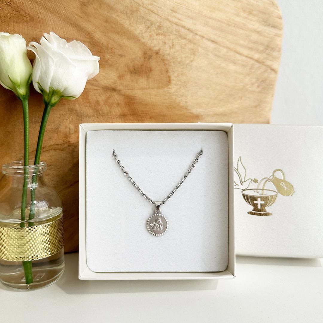 Dieser runde Schutzengel-Anhänger aus 585 Weißgold beeindruckt durch seinen facettierten Rand, der das Licht aus verschiedenen Winkeln reflektiert und für eine lebendige Optik sorgt. Die Oberfläche ist mattiert, wodurch der stilisierte Engel in der Mitte besonders gut zur Geltung kommt. Die Kombination aus ruhiger Mattierung und funkelndem Rand verleiht dem Schmuckstück eine harmonische Ausstrahlung. Ideal als Geschenk zur Geburt, Taufe oder Erstkommunion ist dieser Anhänger nicht nur symbolträchtig, sondern auch zeitlos schön. Auf der Rückseite bietet der Anhänger Platz für eine kurze persönliche Gravur. Für Kinder bis etwa 8 Jahre empfehlen wir eine Kettenlänge von 36cm, ältere Kinder oder Jugendliche tragen 40 bis 42cm. Passende Weißgoldketten führen wir in unterschiedlichen Längen und Ausführungen.