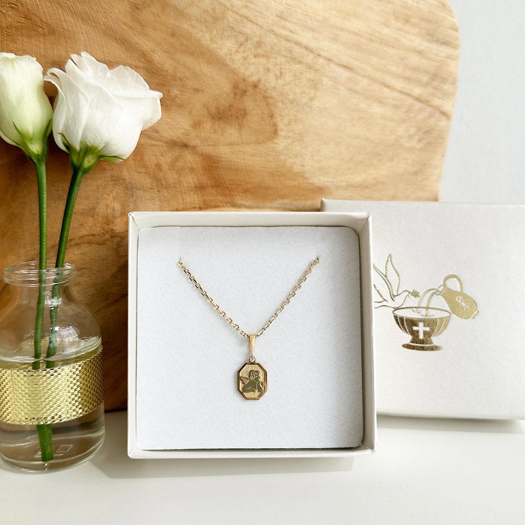 Dieser achteckige Schutzengel-Anhänger aus 585er Gelbgold begeistert durch seine besondere Gestaltung. Der polierte Rand und der glänzende Engel in der Mitte heben sich wirkungsvoll vom mattierten Hintergrund ab und erzeugen so einen edlen Kontrast, der dem Motiv Tiefe und Ausstrahlung verleiht. Durch die leicht erhabene Verarbeitung wirkt der Schutzengel besonders plastisch und detailreich. Ein liebevoll gearbeitetes Schmuckstück, das nicht nur optisch überzeugt, sondern auch als symbolischer Begleiter voller Schutz und Wärme dient – ideal zur Taufe, Geburt oder als liebe Geste für einen Herzensmenschen.