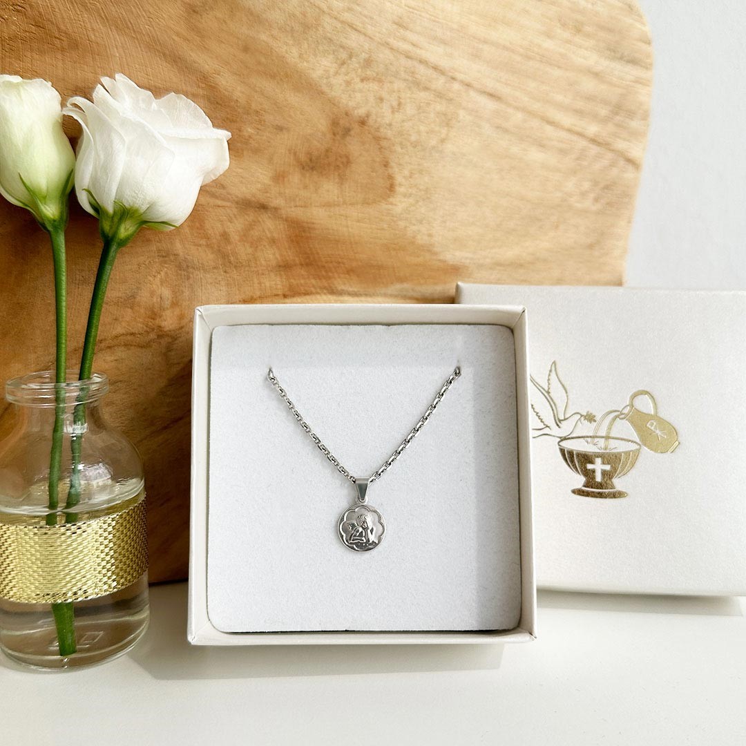 Dieser Schutzengel-Anhänger aus 585er Weißgold besticht durch seine sanfte, runde Form und die blumenartige Umrandung, die dem Engel einen zarten, fast wolkenhaften Charakter verleiht. Der polierte Rand setzt einen eleganten Kontrast zur mattierten Innenseite, die den Engel klar hervorhebt. Die leicht geschwungene, florale Struktur um den Engel sorgt für eine weiche, fast verspielte Ausstrahlung. Mit einer Größe von 10mm ist dieser Anhänger ein wunderschönes Schmuckstück, das Schutz und Geborgenheit symbolisiert. Perfekt für alle, die sich ein zartes, aber dennoch aussagekräftiges Schmuckstück wünschen. Für Jungen und Mädchen gleichermaßen geeignet. Passende Weißgoldketten finden Sie ebenfalls in unserem Sortiment.