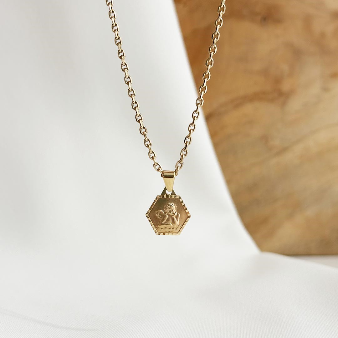 Dieser sechseckige Schutzengel-Anhänger aus 585er Gold ist eine moderne Interpretation des klassischen Symbols. Der facettierte Rand verleiht dem Schmuckstück eine lebendige Ausstrahlung, da er das Licht wunderschön reflektiert. In der Mitte steht der Schutzengel klar und kraftvoll im Fokus, eingebettet in ein einzigartiges geometrisches Design. Besonders bei Jungen ist diese markante Form sehr beliebt, eignet sich aber natürlich ebenso für Mädchen. Ein zeitloses Geschenk zur Taufe, zur Geburt oder zur Erstkommunion. Auf der Rückseite ist Platz für eine kurze persönliche Gravur. Passende Goldketten in unterschiedlichen Längen finden Sie in unserem Geschäft.