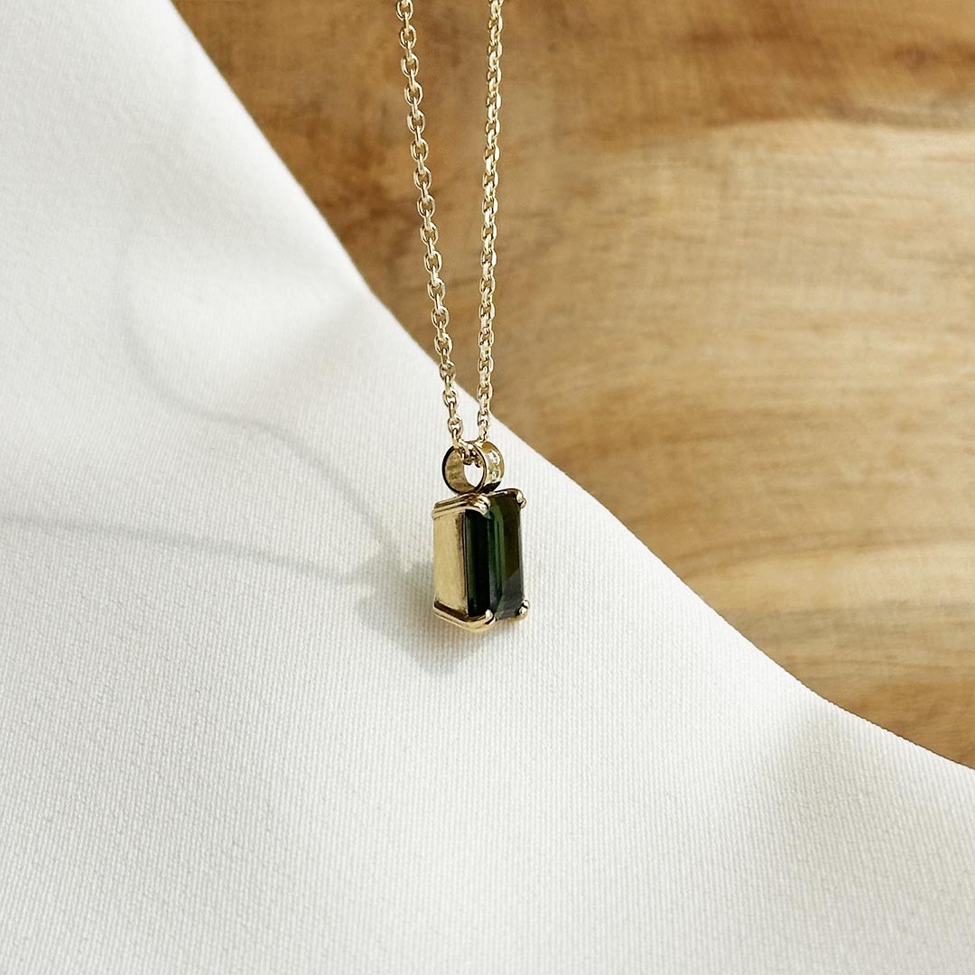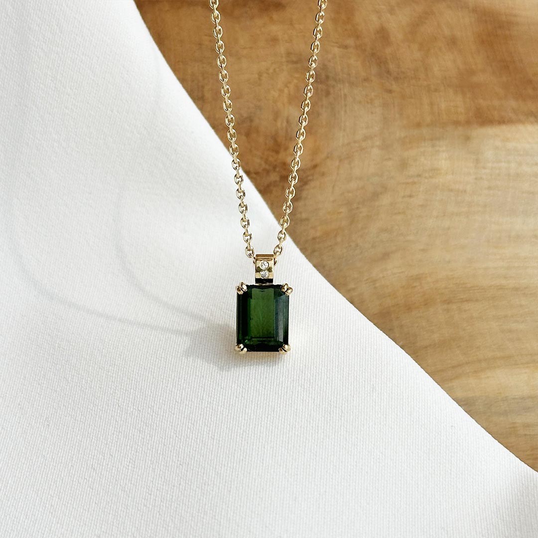 Dieser handgefertigte Anhänger aus 585er Gelbgold fasst einen rechteckigen, intensiv grünen Turmalin in zarten Krappen. Der Edelstein entfaltet sein charakteristisches Strahlen besonders schön im Lichteinfall und zieht durch seine lebendige Farbe alle Blicke auf sich. Zwei kleine, fein eingefasste Diamanten in der Aufhängung setzen einen dezenten Akzent und verleihen dem Anhänger eine zusätzliche Eleganz. Mit einer Größe von 12mm ist er zart genug für den Alltag und dennoch besonders genug für festliche Anlässe. Der Turmalin gilt zudem als Geburtsstein des Monats Oktober – ein passendes Geschenk für Geburtstagskinder oder für alle, die die natürliche Schönheit dieses Steins schätzen. Passende Goldketten finden Sie ebenfalls in unserem Sortiment.
