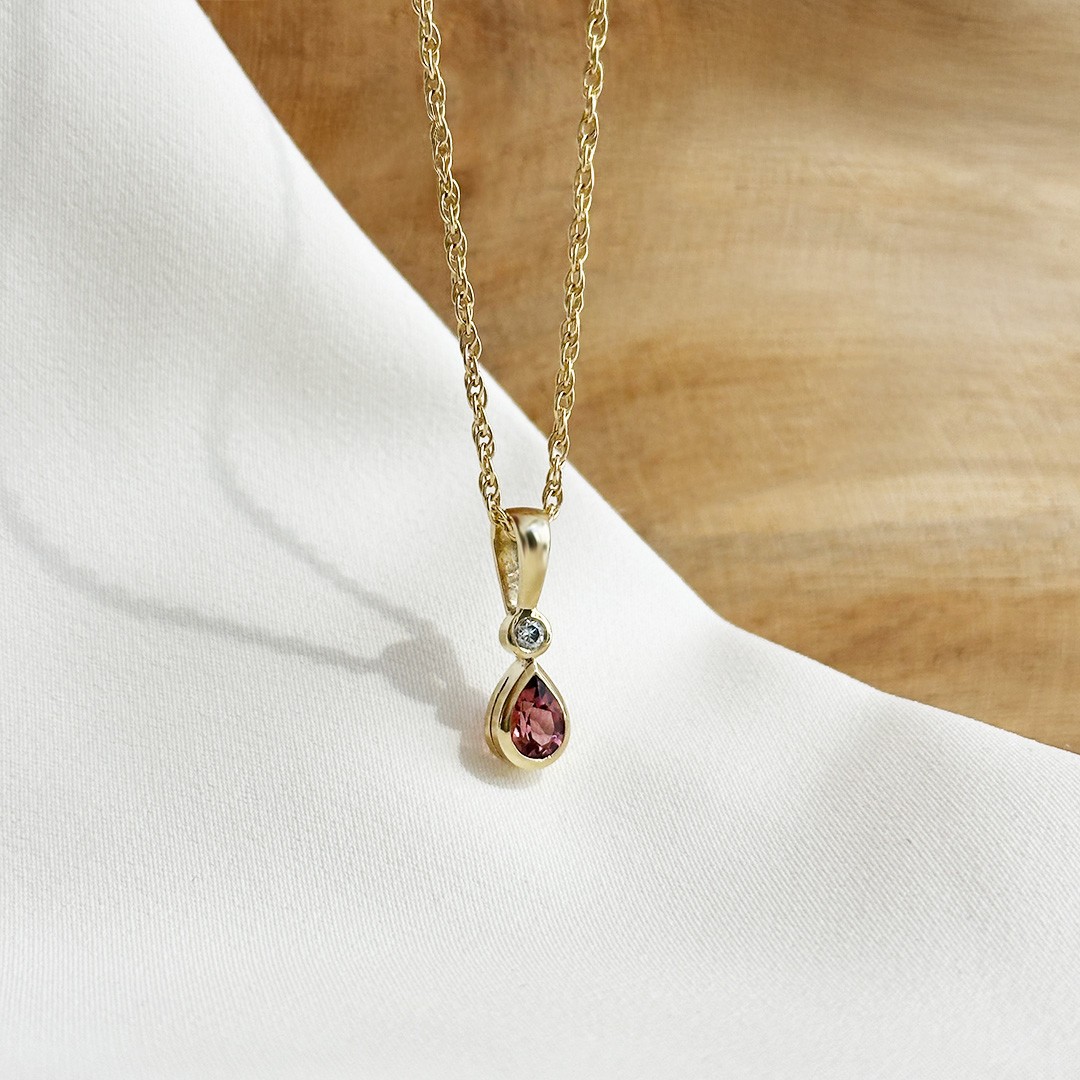Dieser handgefertigte Turmalin-Diamantanhänger aus 585er Gelbgold vereint zeitlose Eleganz mit einem Hauch von Farbe. Ein funkelnder, rund gefasster Brillant geht fließend in einen zart rosafarbenen Turmalin über, der im Tropfenschliff geschliffen ist. Die Kombination aus dem warmen Goldton, den strahlenden Diamanten und dem sanften Rosa des Turmalins verleiht dem Schmuckstück eine besondere Harmonie und schmeichelnde Ästhetik. Perfekt ergänzt wird der Anhänger durch eine feine Goldkette, die durch ihre feine Struktur und raffinierte Optik das Design vollendet.